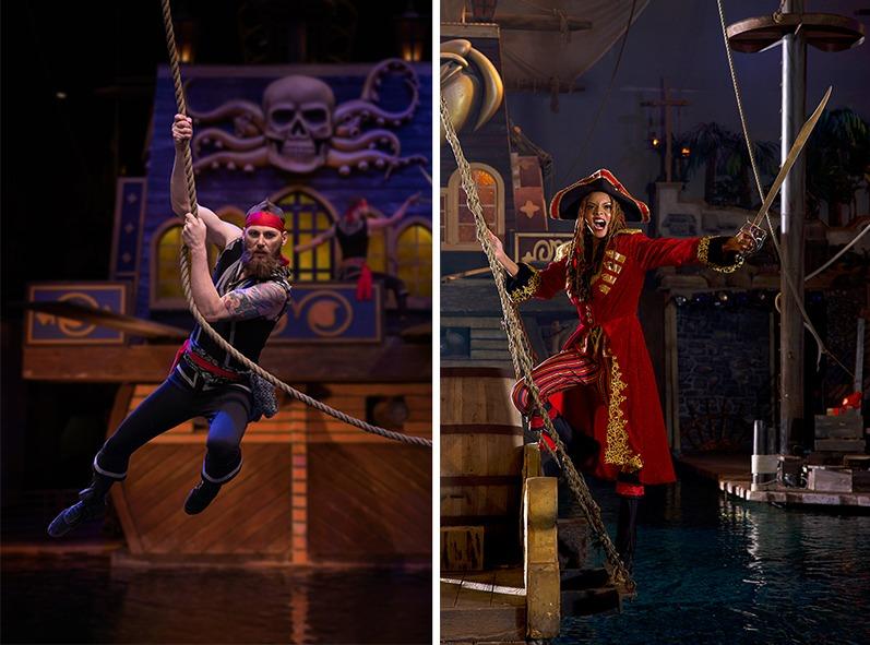 Step inside a massive 60,000-square-foot indoor theater, and you’ll be transported to a hidden pirate cove featuring a 15-foot-deep indoor lagoon and full-sized pirate ships. The story unfolds as legendary pirate Blackbeard and his quartermaster Calico Jack lead the Crimson and Sapphire crews in a fierce battle to recover Davey Jones’ sunken treasure.