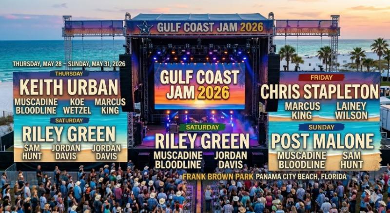 The Gulf Coast Jam, presented by Jim Beam, is officially kicking off the summer season in Panama City Beach from May 28 to May 31, 2026. This four-day country music festival brings 24 artists, including headliners Post Malone, Chris Stapleton, Keith Urban, and Riley Green, to one massive stage at Frank Brown Park.
