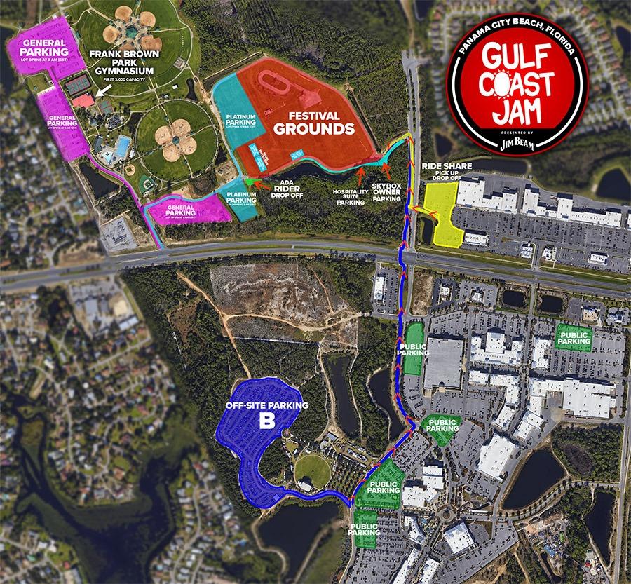Gulf Coast Jam is held at Frank Brown Park adjacent to Pier Park in Panama City Beach, Florida. Frank Brown Park is the largest park in Panama City Beach encompassing over 200 acres. This premier facility will be transformed into the festival site for the four-day weekend. Vendors will provide plenty of options for food, beverages, and activities. Bring your camping chair to relax and enjoy the festivities.