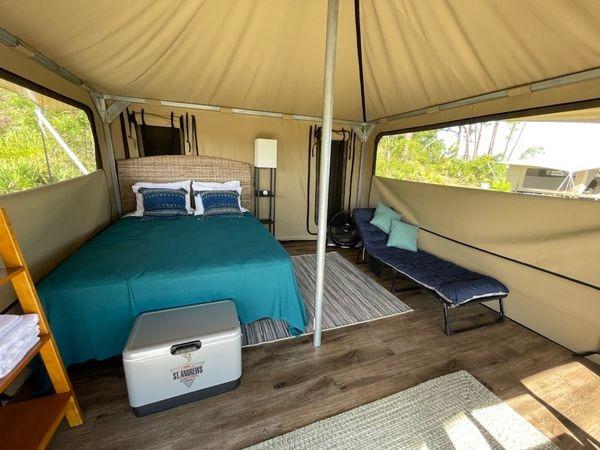 Glamping tents, or Eco Tents, are available at the state park that combine the great outdoors with the luxury of home.The glamping tents offer a water view and come equipped with modern luxuries such as electricity, a queen bed, a twin sized cot, and many other amenities. To book a glamping tent, visit their website.