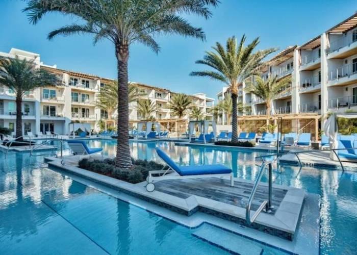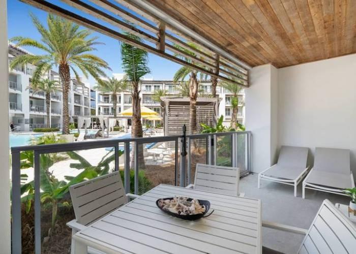 Located at the entrance to Hwy 30A in Inlet Beach, the two- and three-bedroom vacation rentals feature open floor concept allowing guests plenty of room to gather in the kitchen and living room spaces. Bedrooms are furnished with king- and queen-sized beds and feature attached private bathrooms and Restoration Hardware finishing touches. Private balconies overlook the beautiful pool setting in the center of the property.