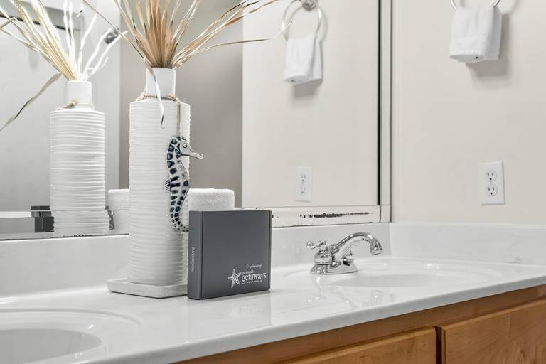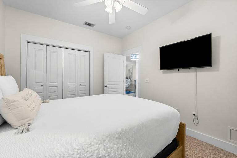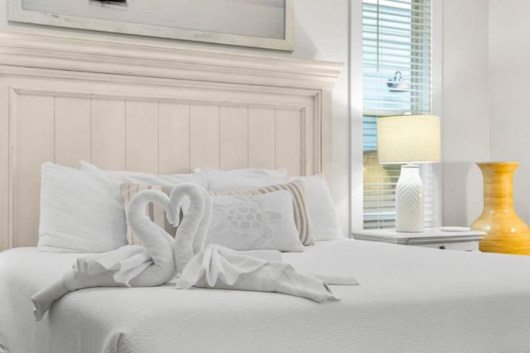 The interior is filled with charming coastal decor, modern furnishings, and all the comforts of home, including a fully equipped kitchen and a private washer and dryer. When you want to relax away from the beach, you can step out onto the front porch. Sip a morning cup of coffee or gather on the covered patio to reminisce about all the fun to be had. Each bedroom offers a flatscreen TV, and high-speed Wi-Fi is included with your stay (great for remote work).