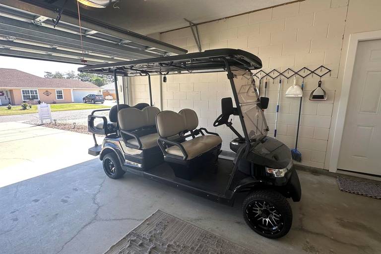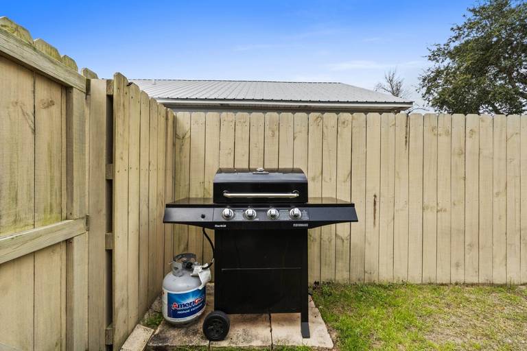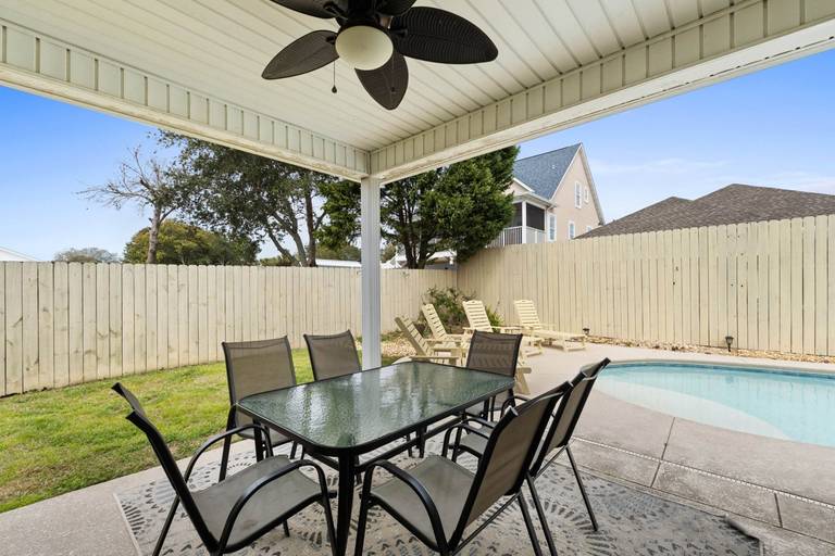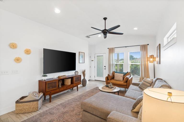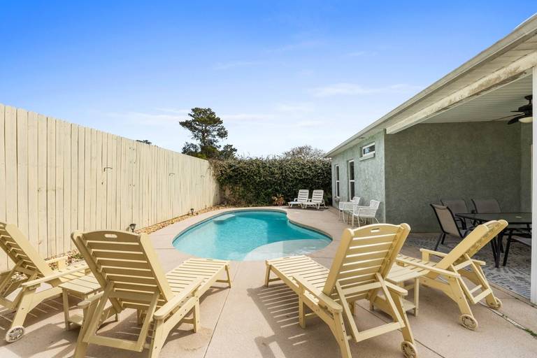 Start your mornings with a dip in the pool or coffee on the patio, then load up the provided golf cart for a quick, 0.4-mile ride to Beach Access #87. No stairs, plenty of parking, and soft white sand waiting for you. Inside, enjoy a bright, spacious living area with a 70” TV, a fully equipped kitchen, and a fenced backyard perfect for pets and family fun.