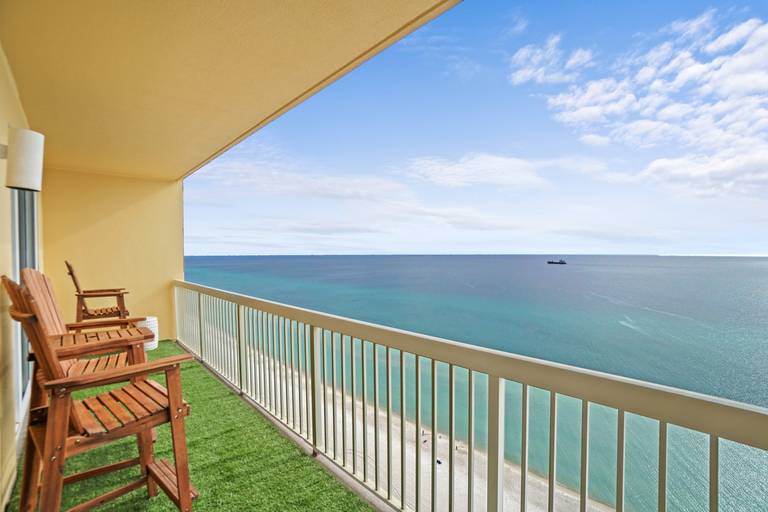 The balcony has turf which is easy on the feet and the view from the balcony is expansive. Enjoy sunrises and sunsets every morning/evening or watch the fireworks on NYE or July 4th. It’s the perfect spot! Due to adding captain chairs you will have no problem with the balcony railing obstructing your view.