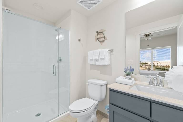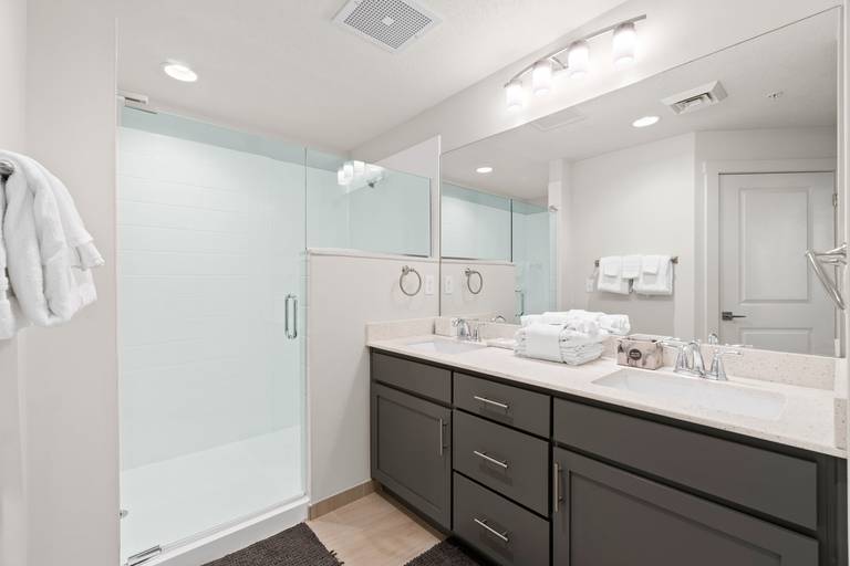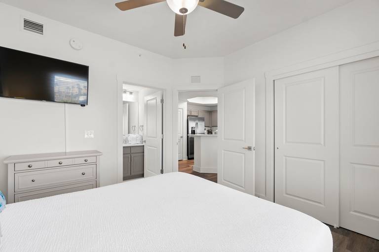 - Primary Suite – King bed, private balcony access, walk-in closet, large smart TV, en-suite spa-inspired bathroom with double walk-in shower & dual vanity.