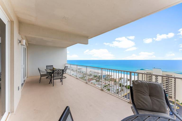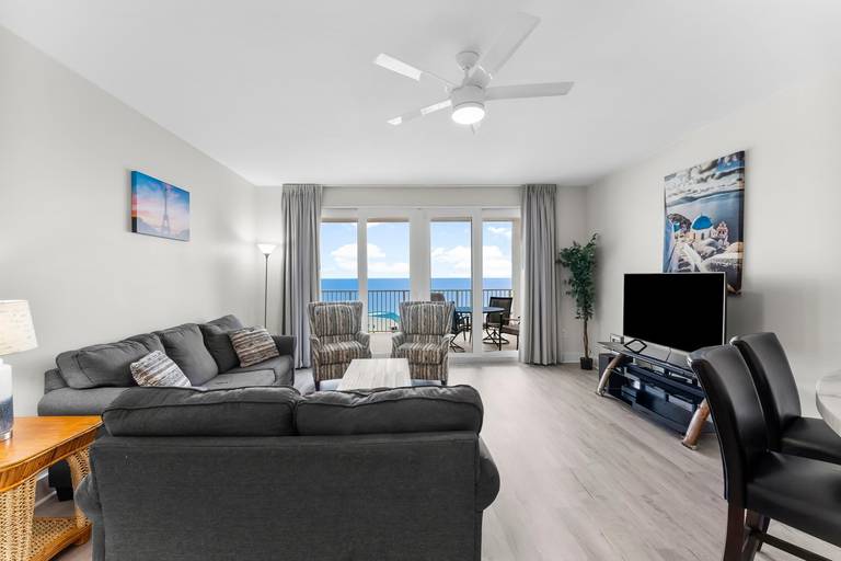 View ocean waters of the Gulf of Mexico and feel the breeze while you relax on a huge covered balcony of this 3 Bedroom, 3 Bath condo from the 17th floor of this popular family/kids friendly resort in Panama City Beach. This condo sleeps up to 10 guests with a fully equipped kitchen, dining table, living room, sofa bed, bunk bed, patio furniture, and washer/dryer for laundry.