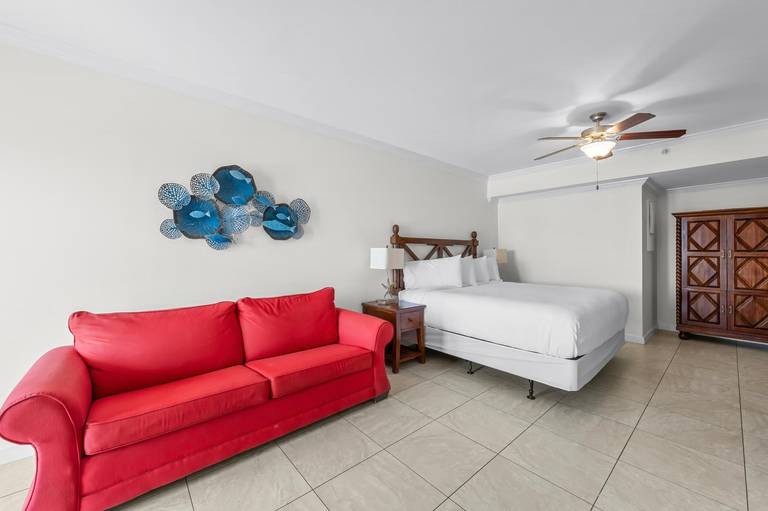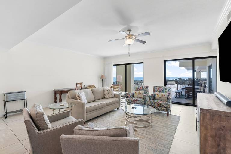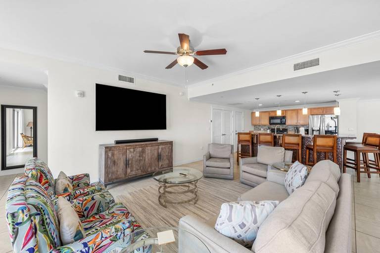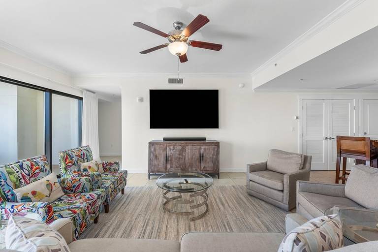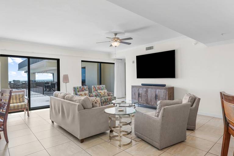 * Living Area with Gulf View, Full Sleeper Sofa and 70" Smart TV