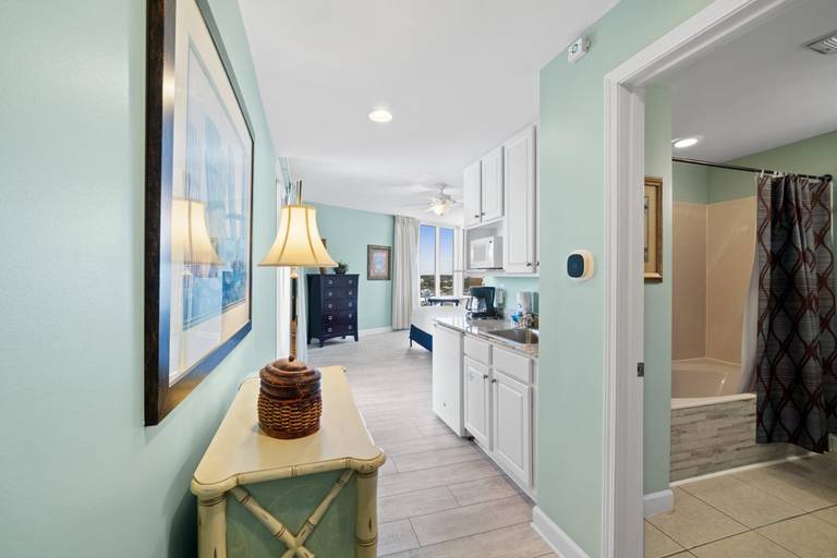 Perfect for larger families or couples traveling together, the condo features a full kitchen and two private suites and a guest bedroom. One of the suites is an efficiency lockout unit, complete with a mini-fridge, sink, microwave, and coffee maker for added convenience.