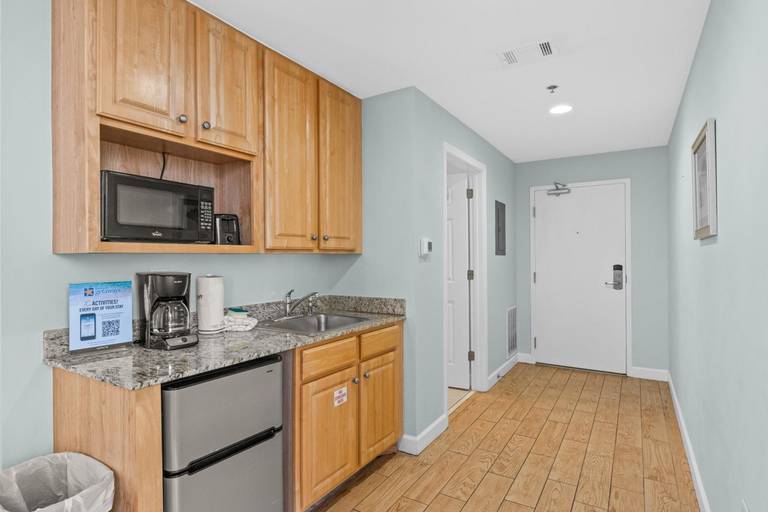 * Kitchenette - Small Fridge (no freezer), Coffee Maker, Microwave