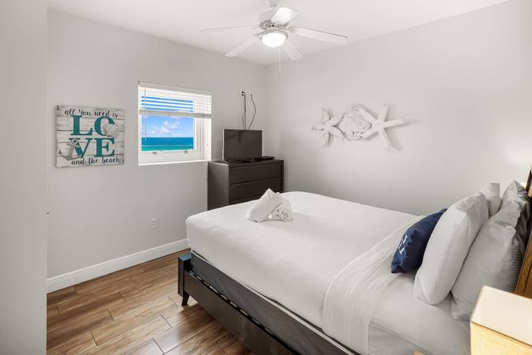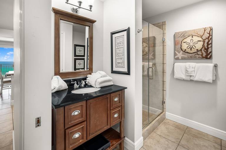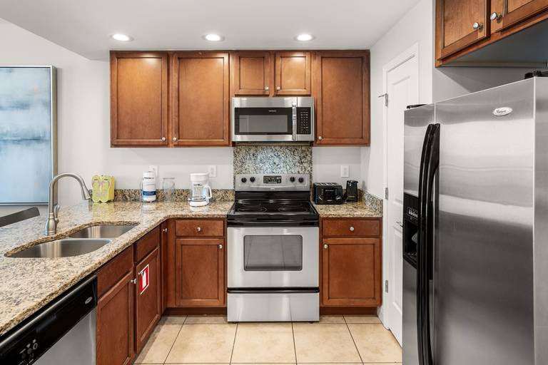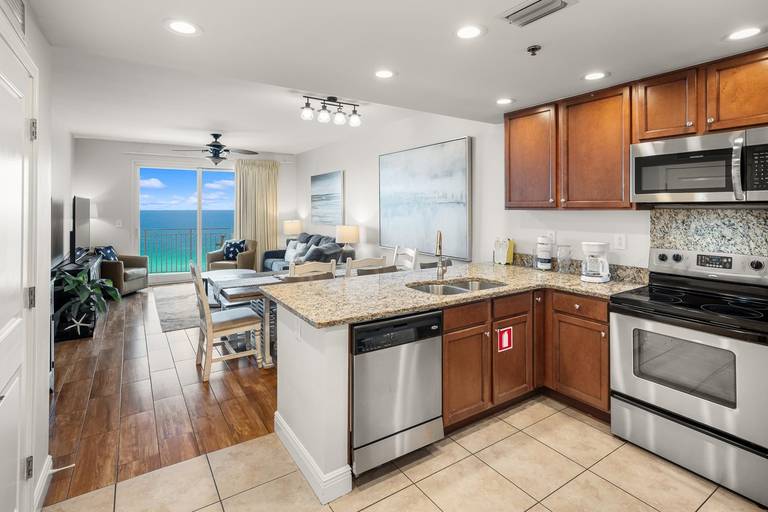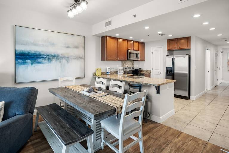 A bright atmosphere will greet you the moment you step inside, along with an open floor plan that combines the upgraded and well-equipped kitchen, the spacious living room, and the dining area. There is plenty of room and privacy for the whole family in this 1600 sq ft property. The many upgraded extras include stainless steel appliances, hardwood tile flooring, ceramic tile throughout, and TVs in all of the bedrooms and living room. This beachfront retreat offers guests a convenient balcony overlooking the beach which can be accessed directly from the primary bedroom or living room. Sterling Breeze Resort is complete with a sizable infinity pool (heated seasonally), an outdoor hot tub, a snack bar/grill and a gym.