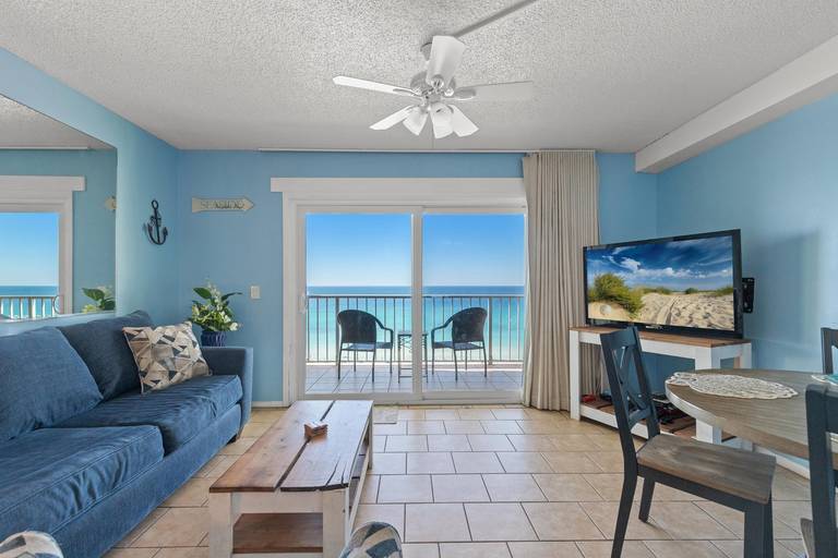 Welcome to Summit Beach Resort 902, a 1-bedroom, 1.5-bathroom beachfront condo in Panama City Beach, Florida by Panhandle Getaways. Perfect for couples or small families, this Gulf-front retreat offers a bright, open living area with incredible views, a fully equipped kitchen with breakfast bar, and a cozy dining space. Step onto your private balcony to take in the sights and sounds of the beach, or unwind indoors with all the comforts of home.