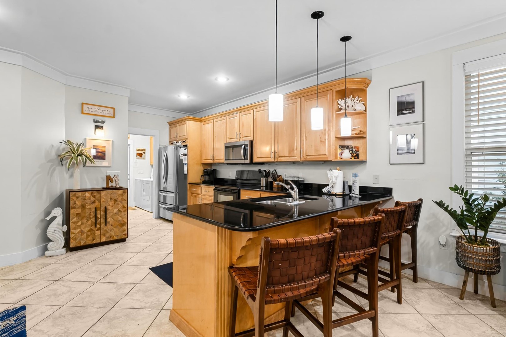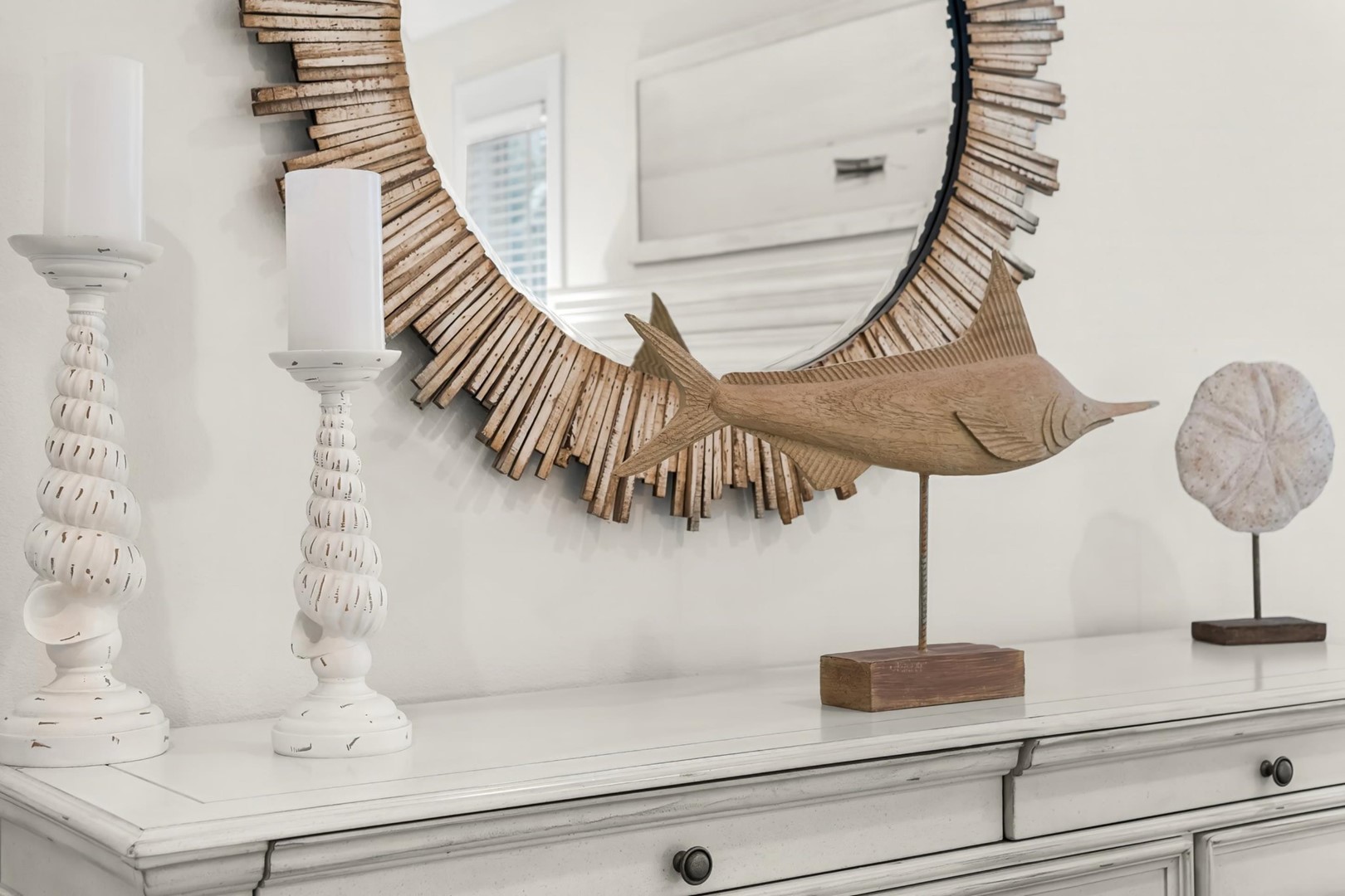 The interior is filled with charming coastal decor, modern furnishings, and all the comforts of home, including a fully equipped kitchen and a private washer and dryer. When you want to relax away from the beach, you can step out onto the front porch. Sip a morning cup of coffee or gather on the covered patio to reminisce about all the fun to be had. Each bedroom offers a flatscreen TV, and high-speed Wi-Fi is included with your stay (great for remote work).