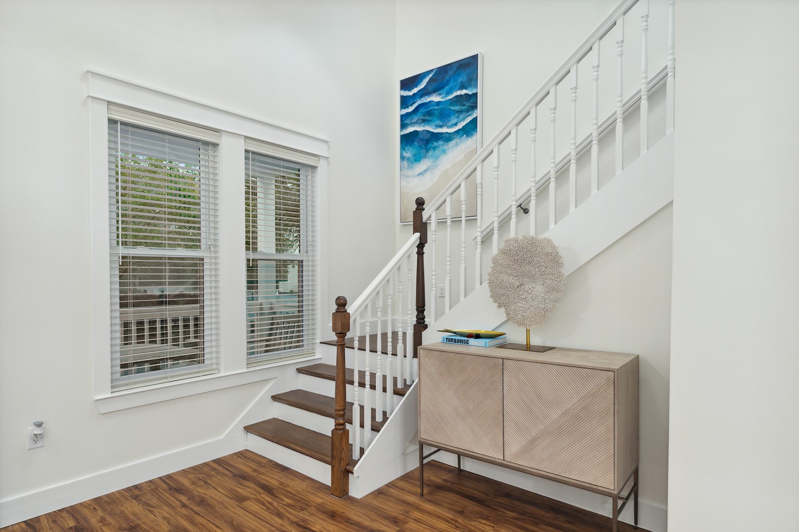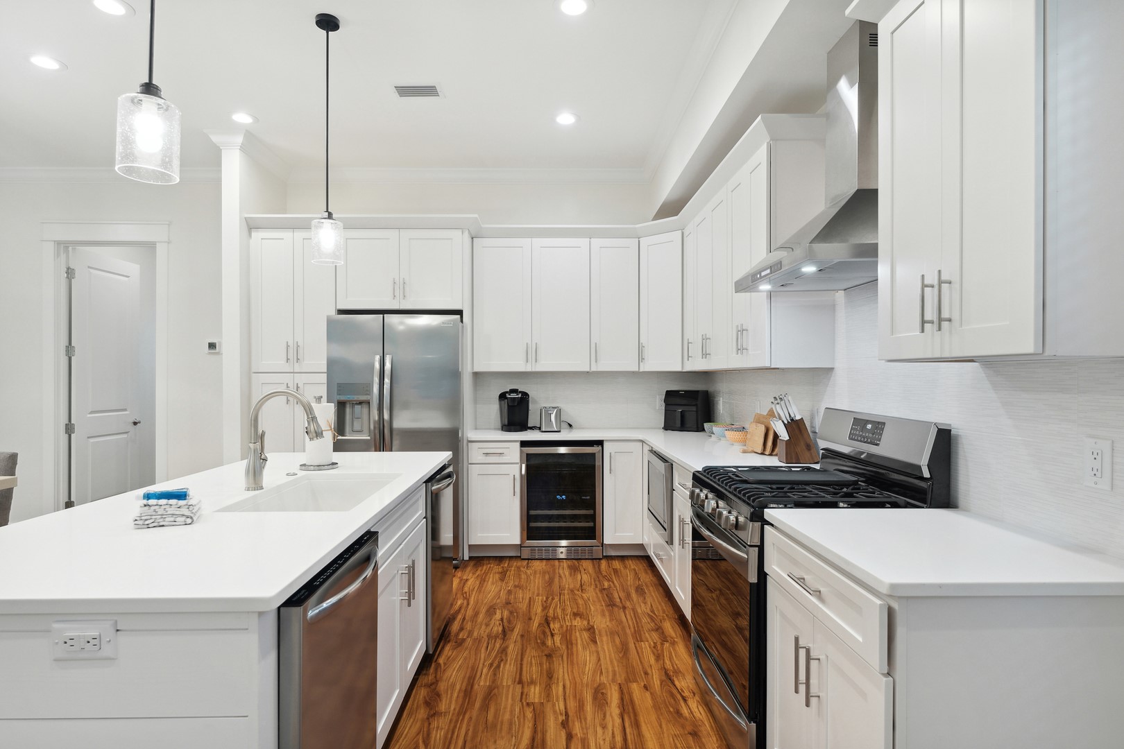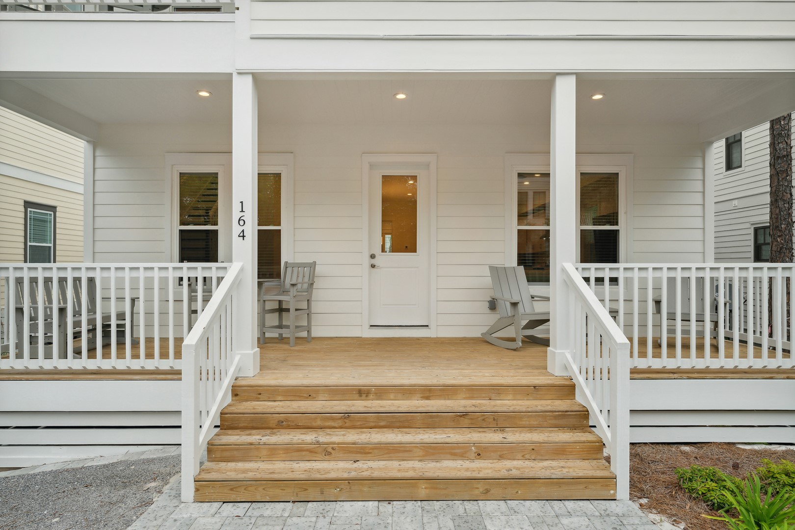 This home features beautiful and posh furnishings throughout with detailed woodwork, shiplap, hardwood floors, quartz counters, 2 master suites, spacious covered porch, outdoor shower and lush landscaping offering additional privacy for guests.