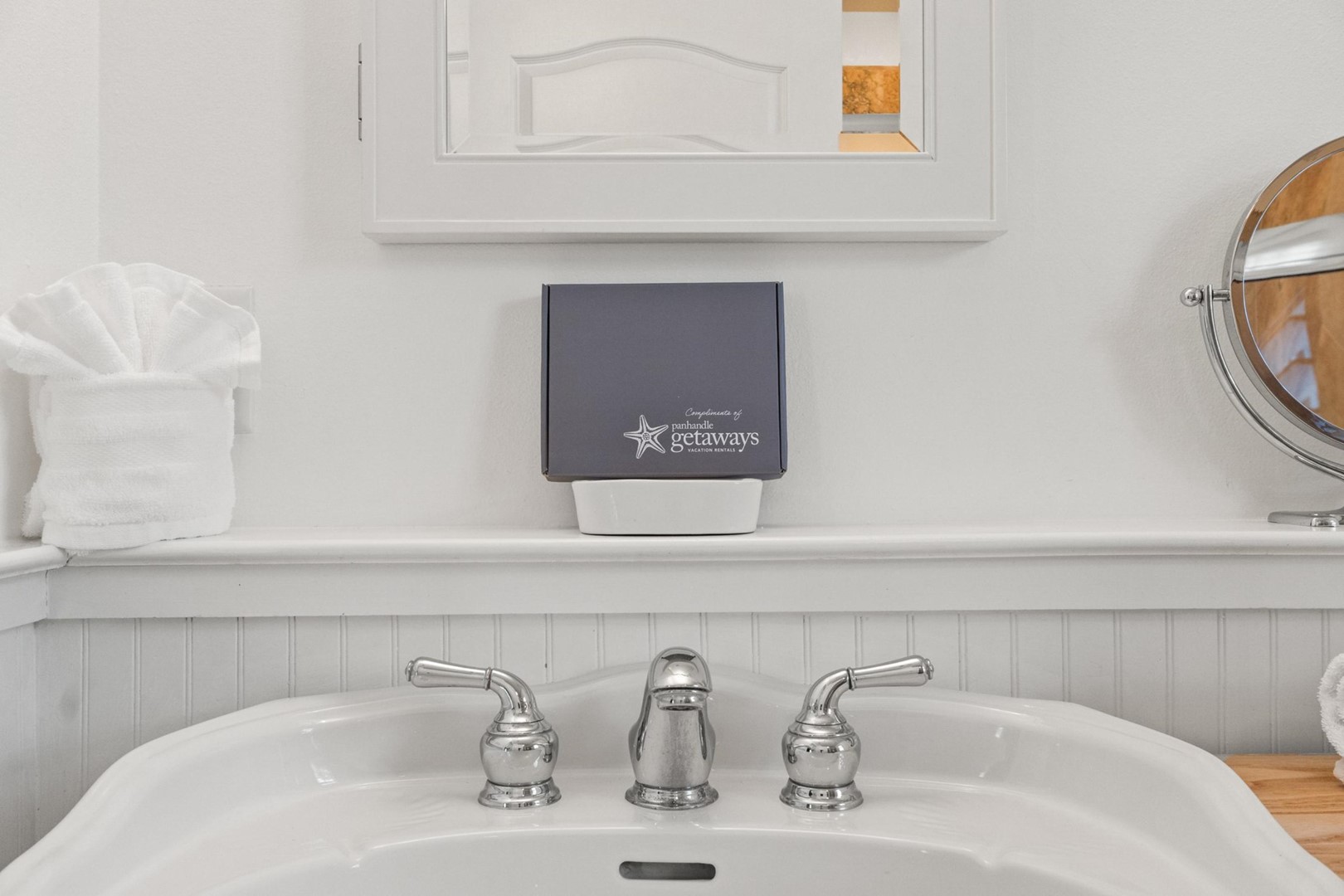 INITIAL SUPPLIES UPON ARRIVALPanhandle Getaways furnishes a few essential items for guests to utilize until they can get to the grocery store. Initial Supplies include: Dishwasher soap, small washing machine powder, each bathroom has amenities (like hotel but NOT restocked) shampoo, conditioner, soap bar and body wash. One roll of toilet paper in each bathroom & one paper towel roll in the kitchen. All bed linens & towels are provided. We encourage guests to bring beach towels for use at the pool and beach.