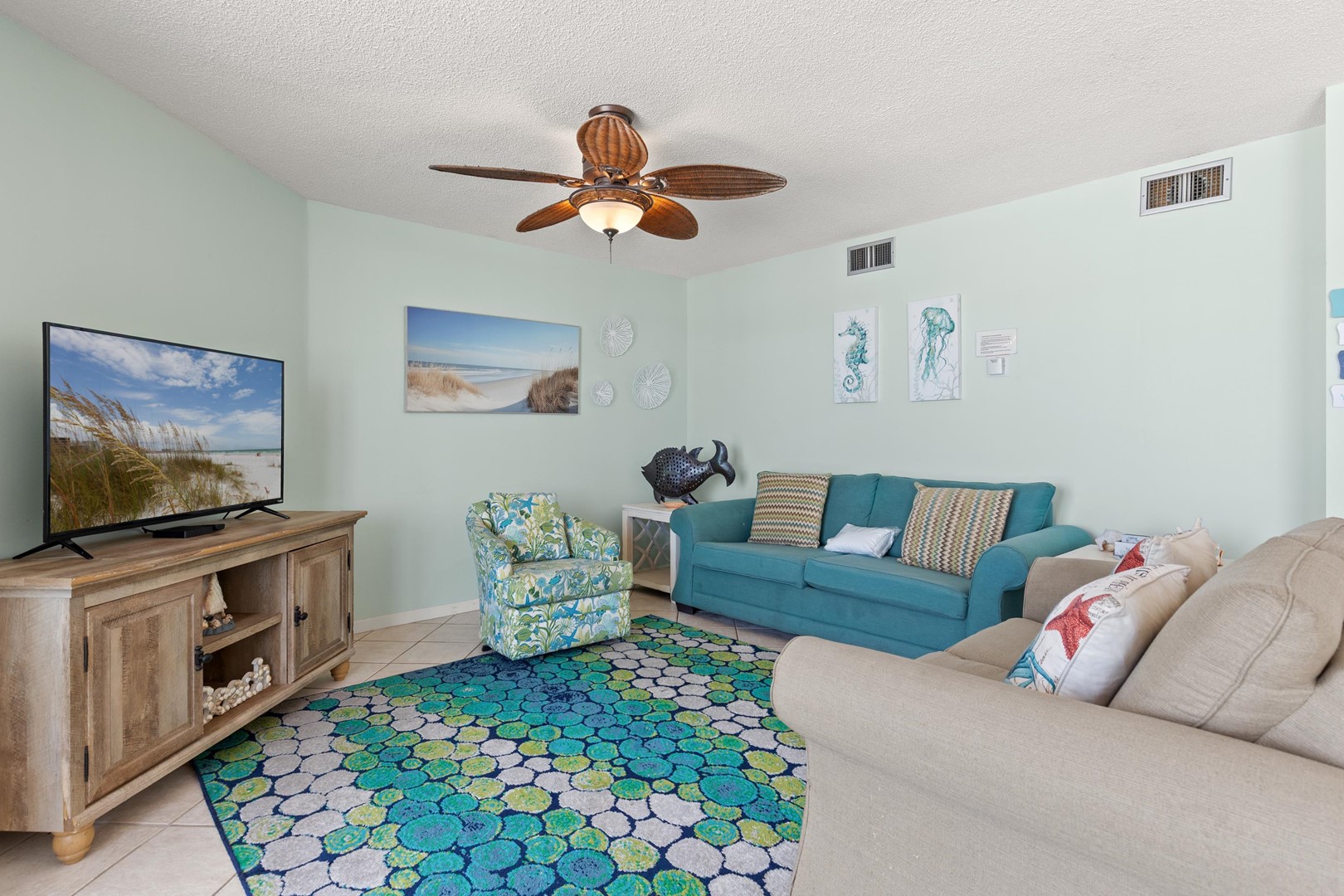 • Spacious Living Area: A large, open layout featuring a Queen Sleeper Sofa and direct Gulf views.