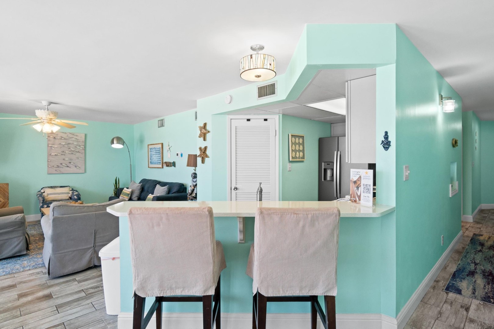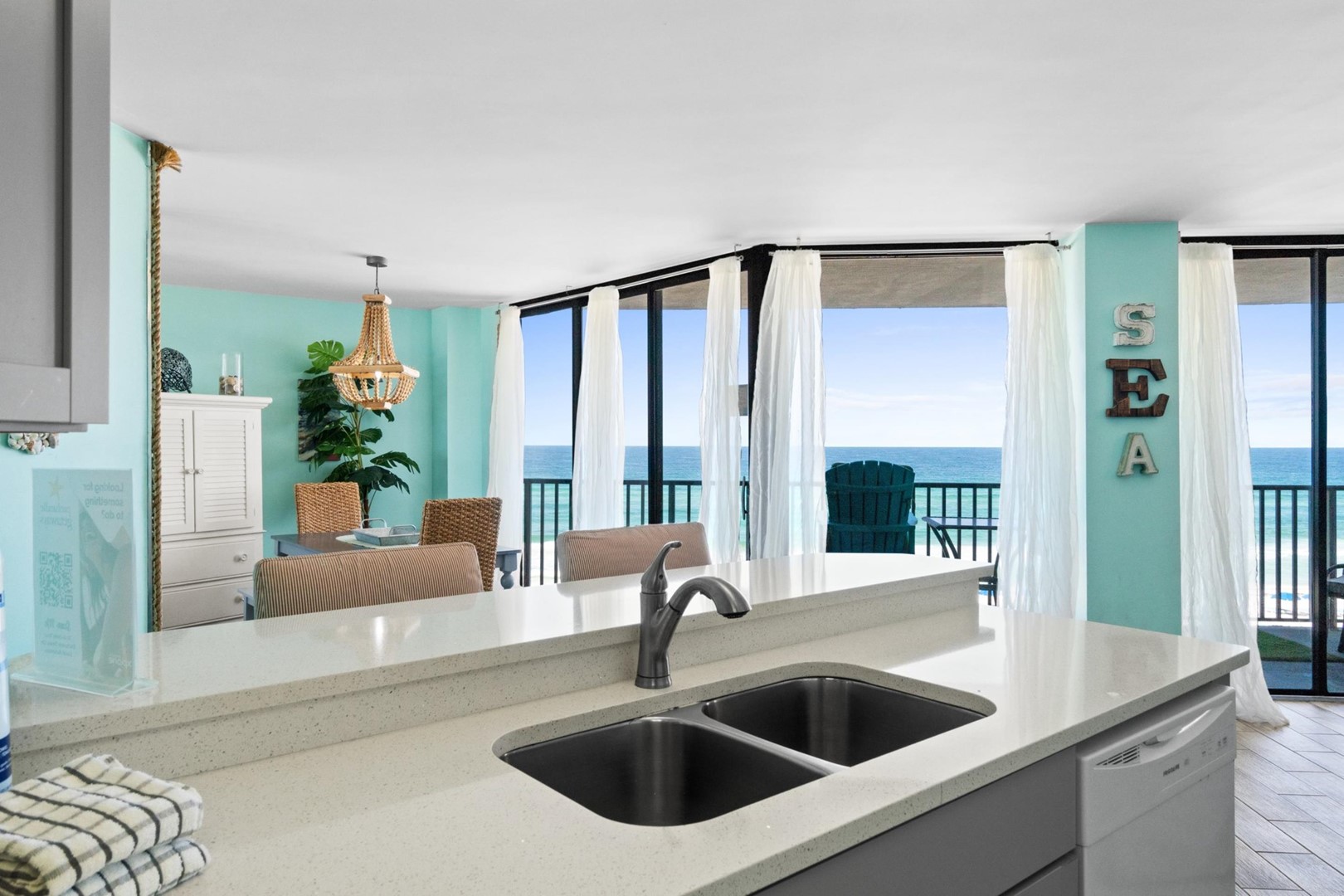 • Large living area with Gulf views and queen sleeper sofa with 4" memory foam topper