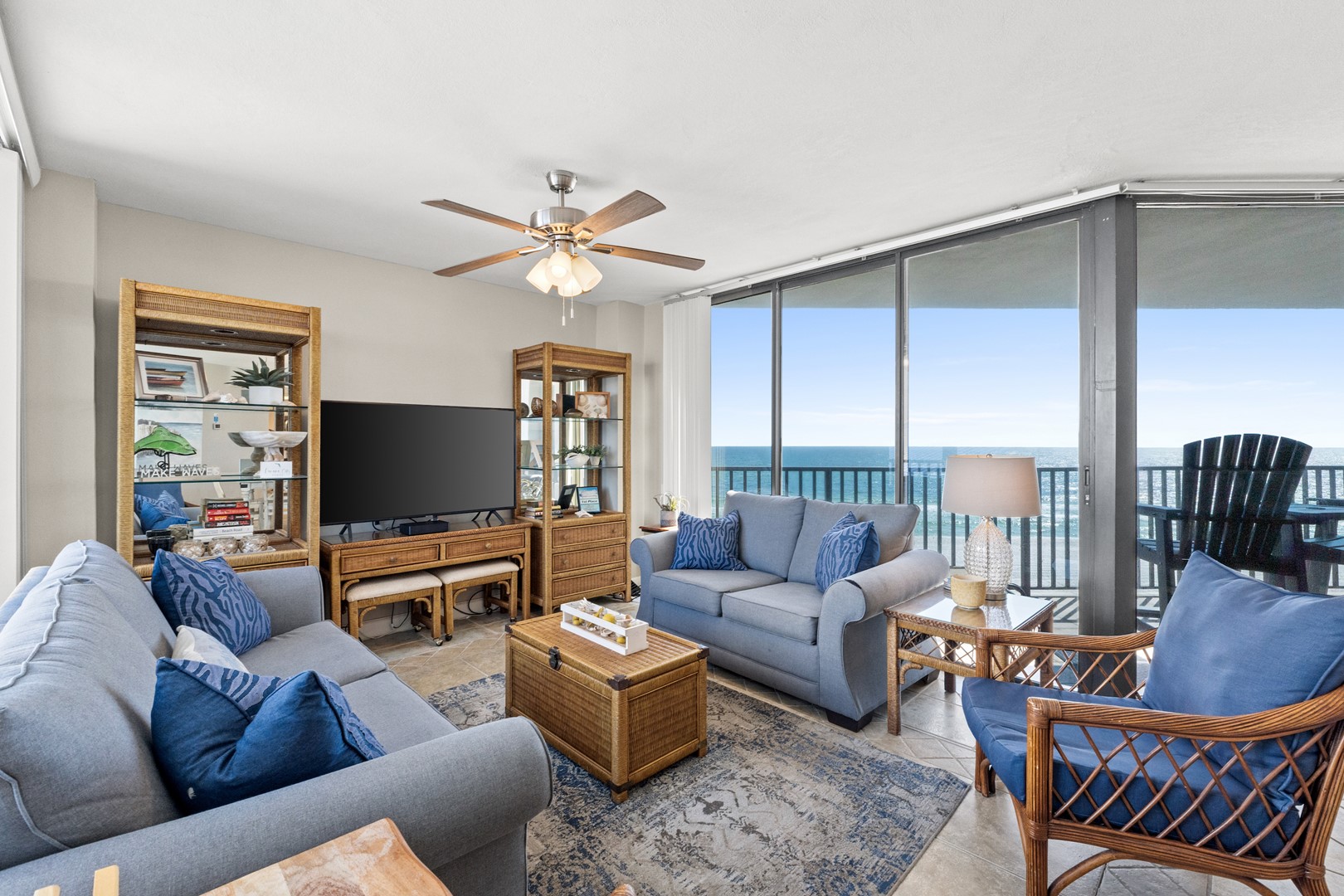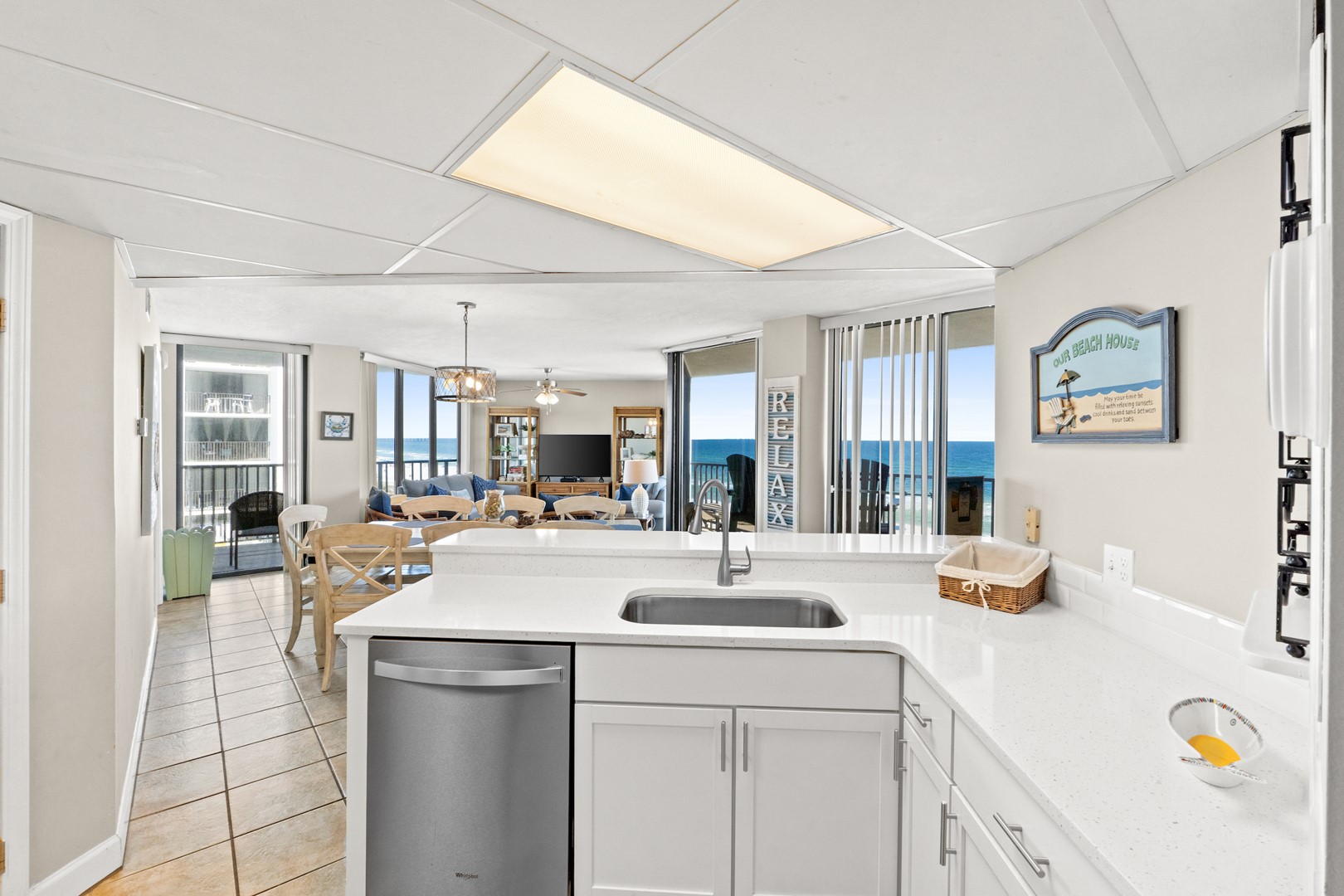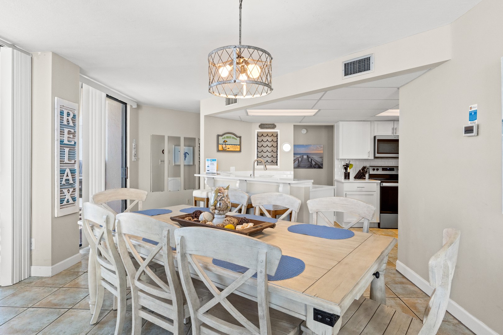 Welcome to AquaVista 406W, a direct beachfront condo in Panama City Beach, Florida, by Panhandle Getaways. With expansive windows in the living and dining areas, this vacation rental highlights panoramic Gulf views and blends comfort, convenience, and a prime location just one mile from Pier Park.