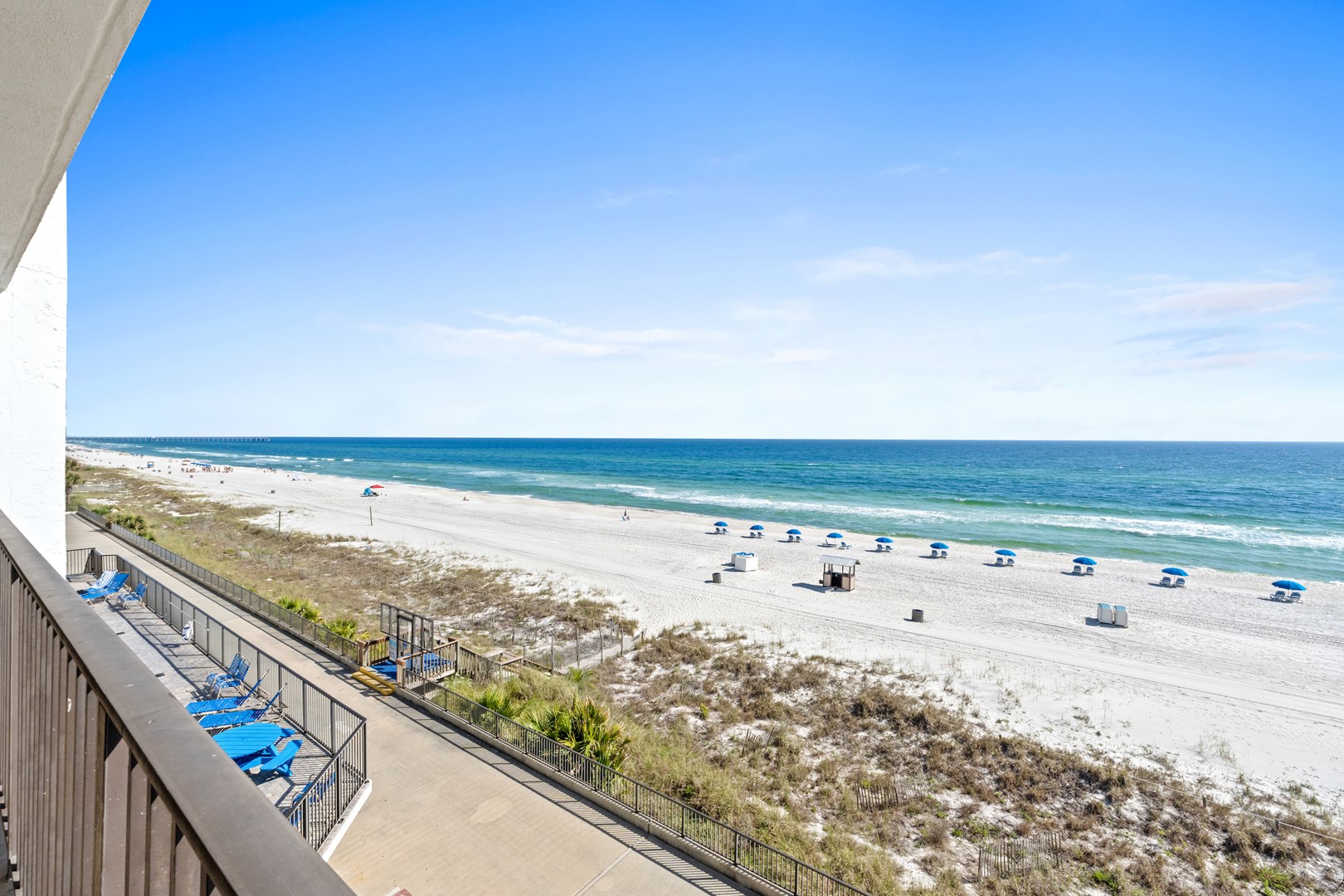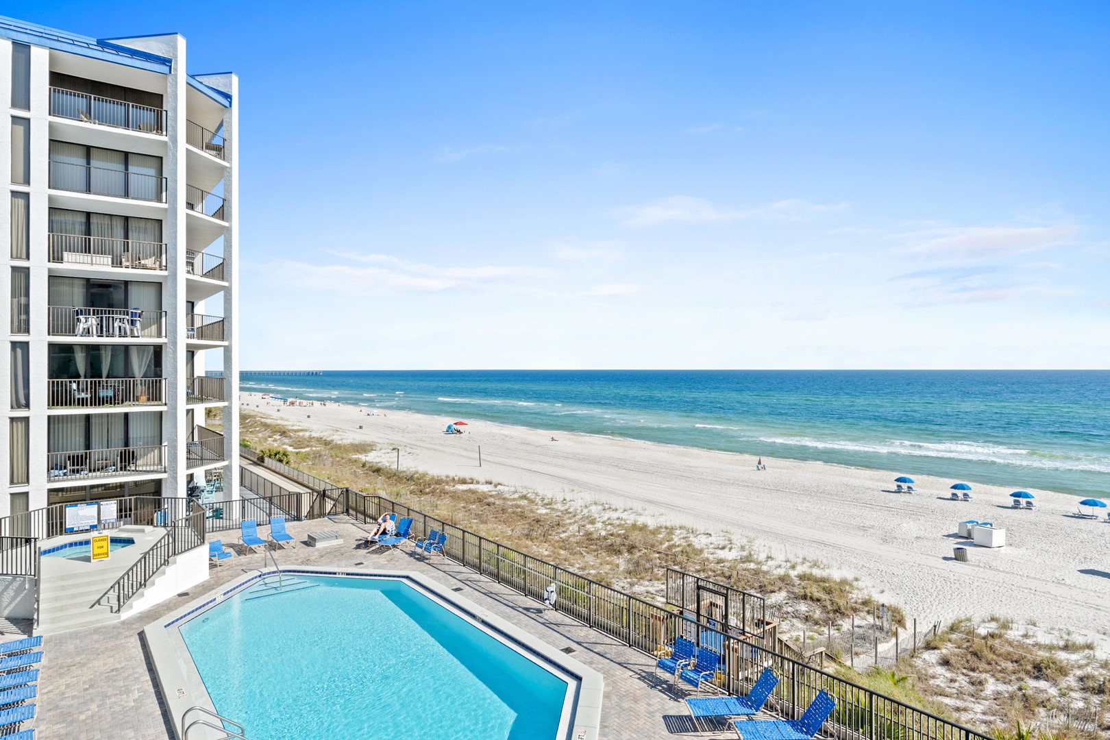 AquaVista 406W by Panhandle Getaways is a beachfront condo in Panama City Beach, FL, offering sweeping Gulf views, a private balcony, and resort amenities including a pool, hot tub, and sundeck.