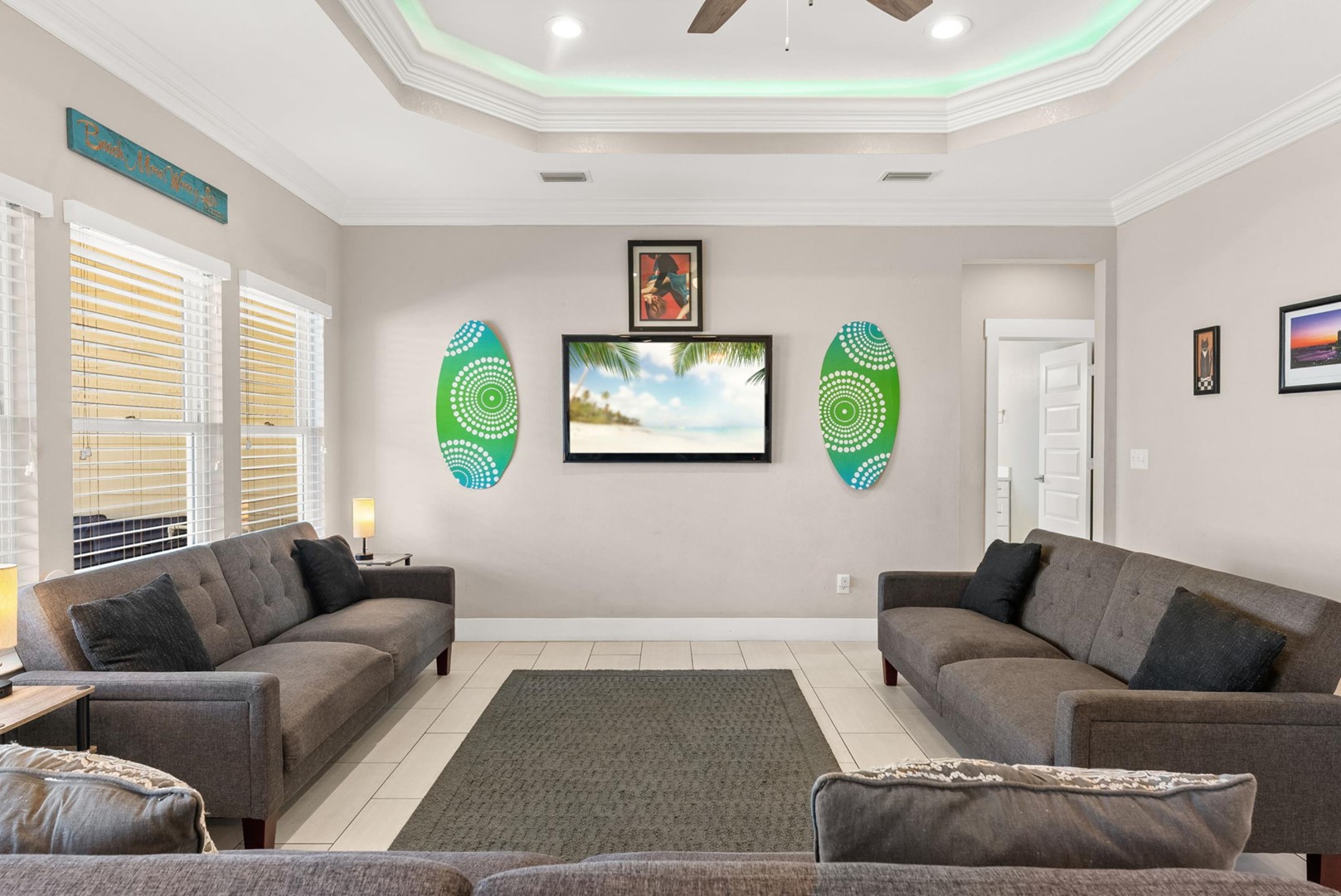 • Spacious living area with 55” Smart TV and 3-sofa conversation area