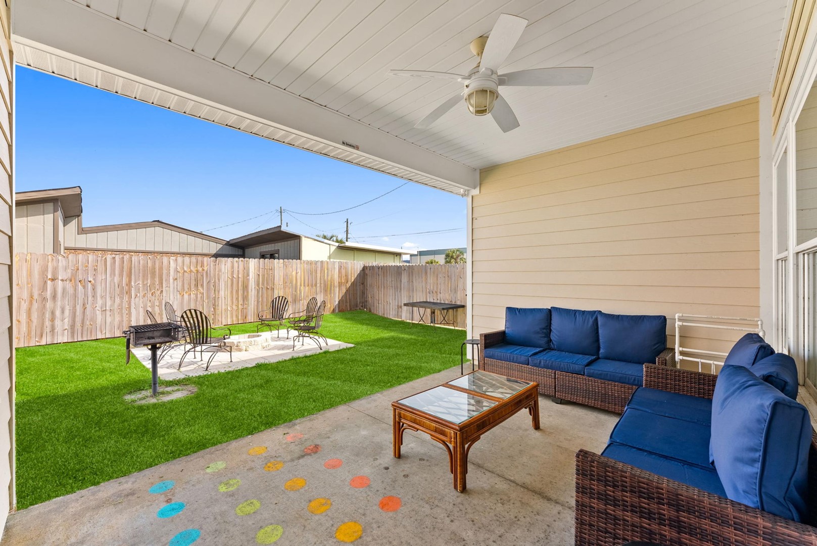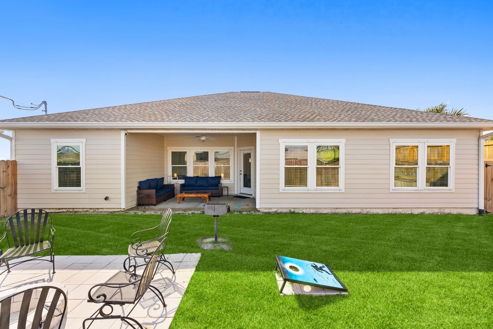 Welcome to Beachside Sunrise, a 4-bedroom, 2-bathroom coastal retreat crafted for families, friends, and groups looking to combine comfort with fun. The open, airy living area invites you to relax with a 55” Smart TV and a cozy 3-sofa lounge perfect for conversation or movie nights. The fully equipped kitchen, complete with a breakfast bar, makes meal prep effortless, while streaming TVs in every bedroom ensure everyone can unwind on their own schedule. Outside, the private backyard is a true playground for all ages, featuring a park-style charcoal grill, ladder ball, cornhole, a fire pit for evening gatherings, and an indoor arcade with three game consoles for endless entertainment. With ground-level access, parking for up to four vehicles, and a complimentary beach cart ready for daily trips to the sand, this home blends convenience with coastal charm for a truly carefree getaway.