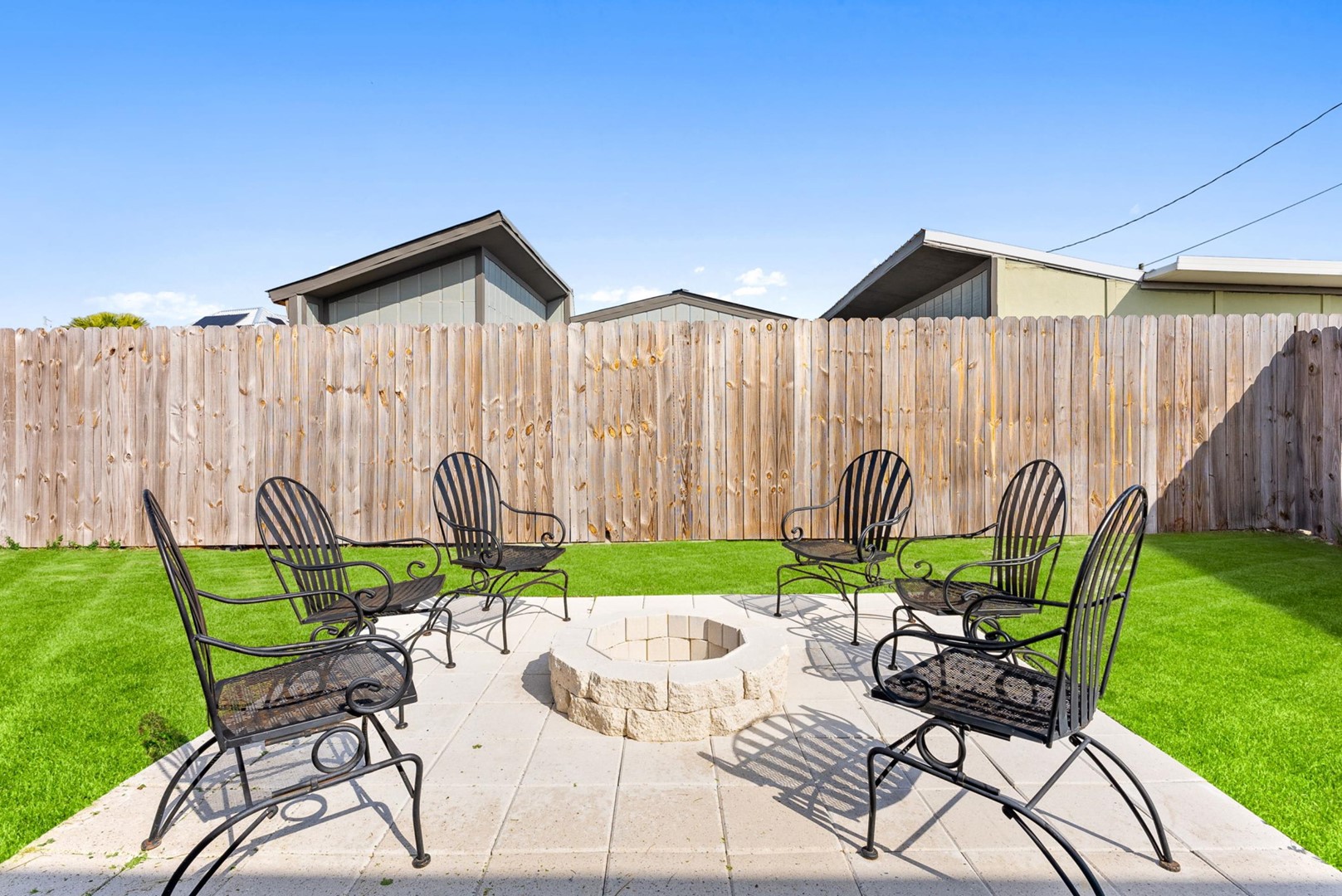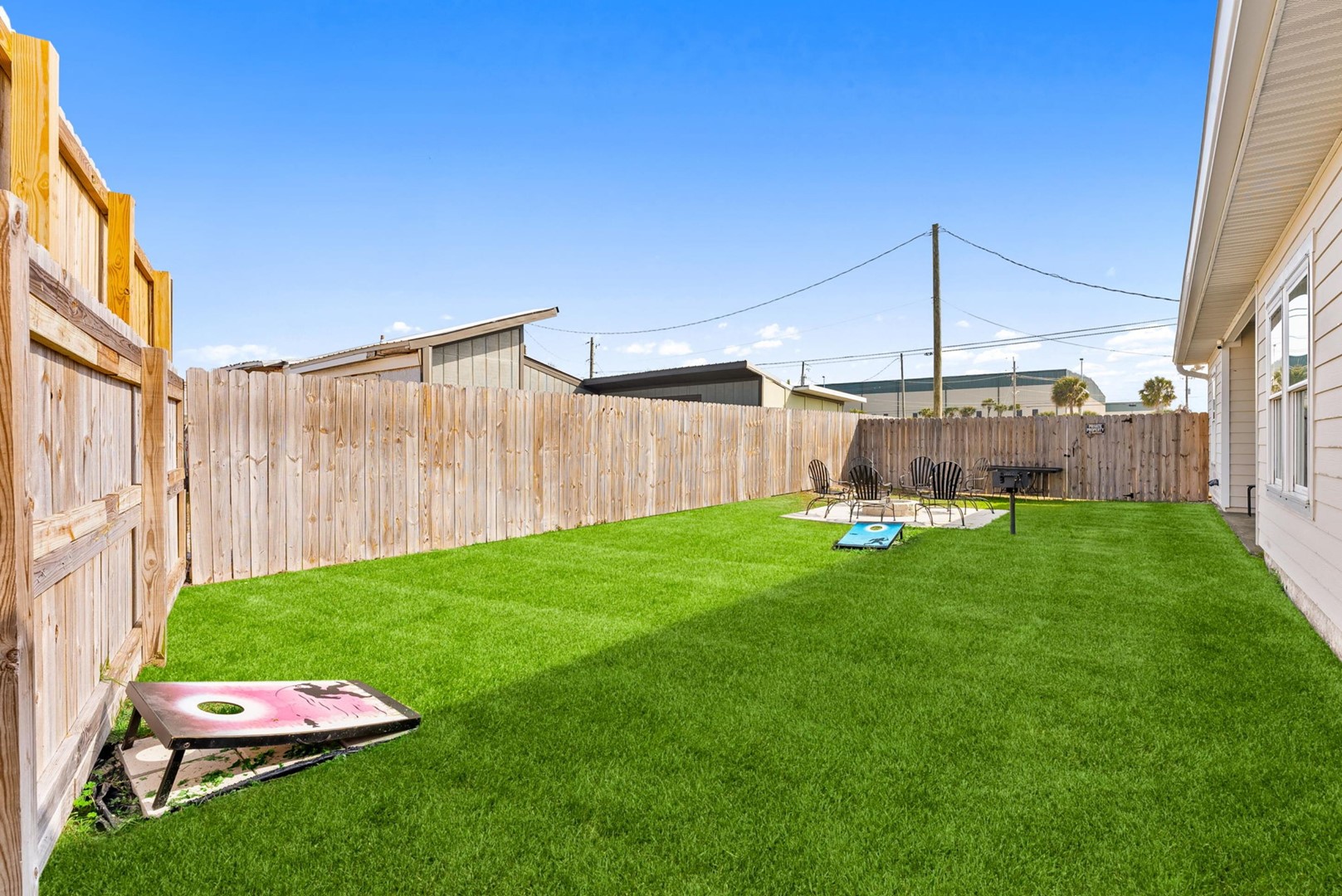 • Secluded backyard with ladder ball, cornhole, and fire pit
