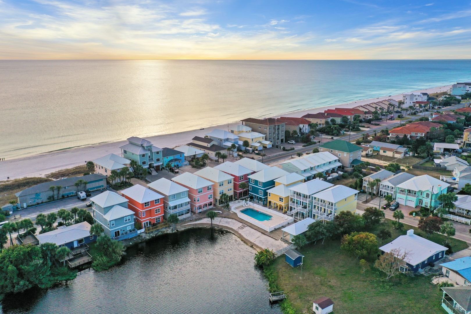 Dreams Come True by Panhandle Getaways is a pet-friendly beach house in Panama City Beach, FL, offering lake views, beach access just steps away, and resort-style amenities including a pool, fire pit, and game room for family fun.