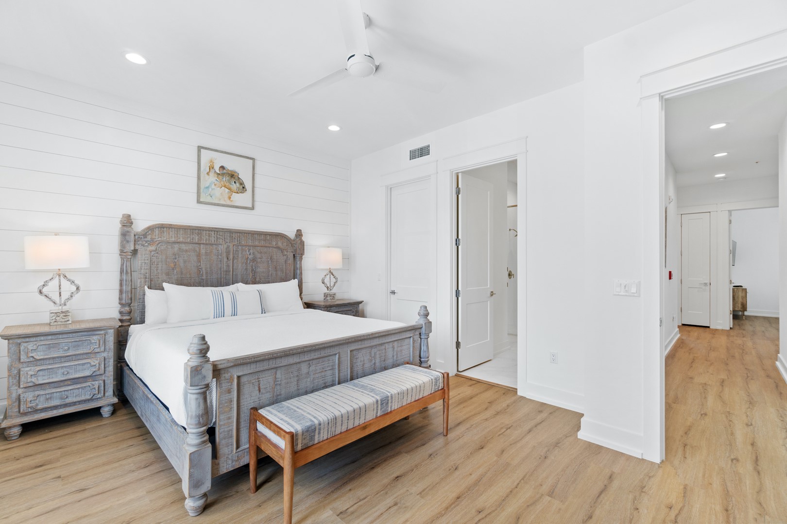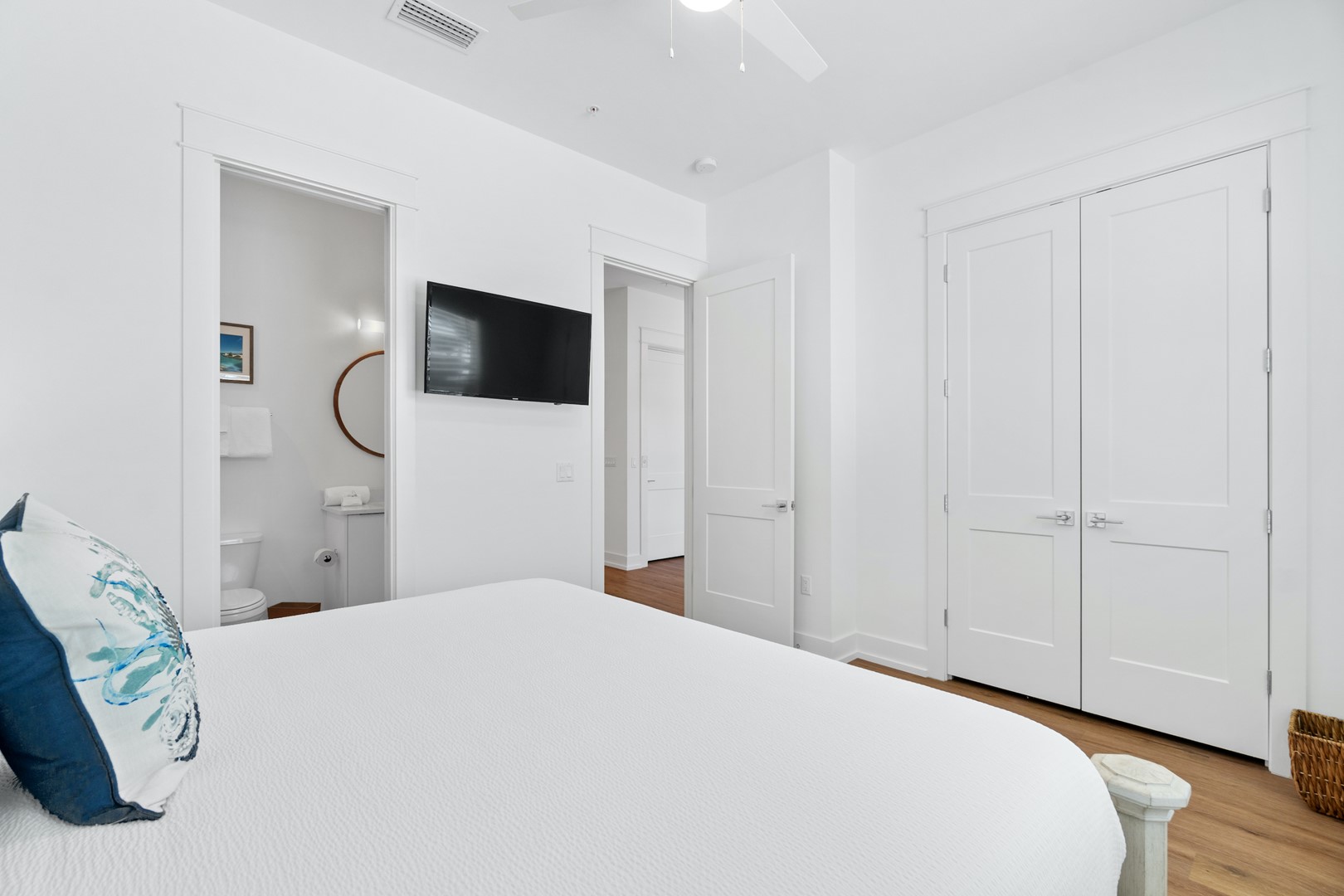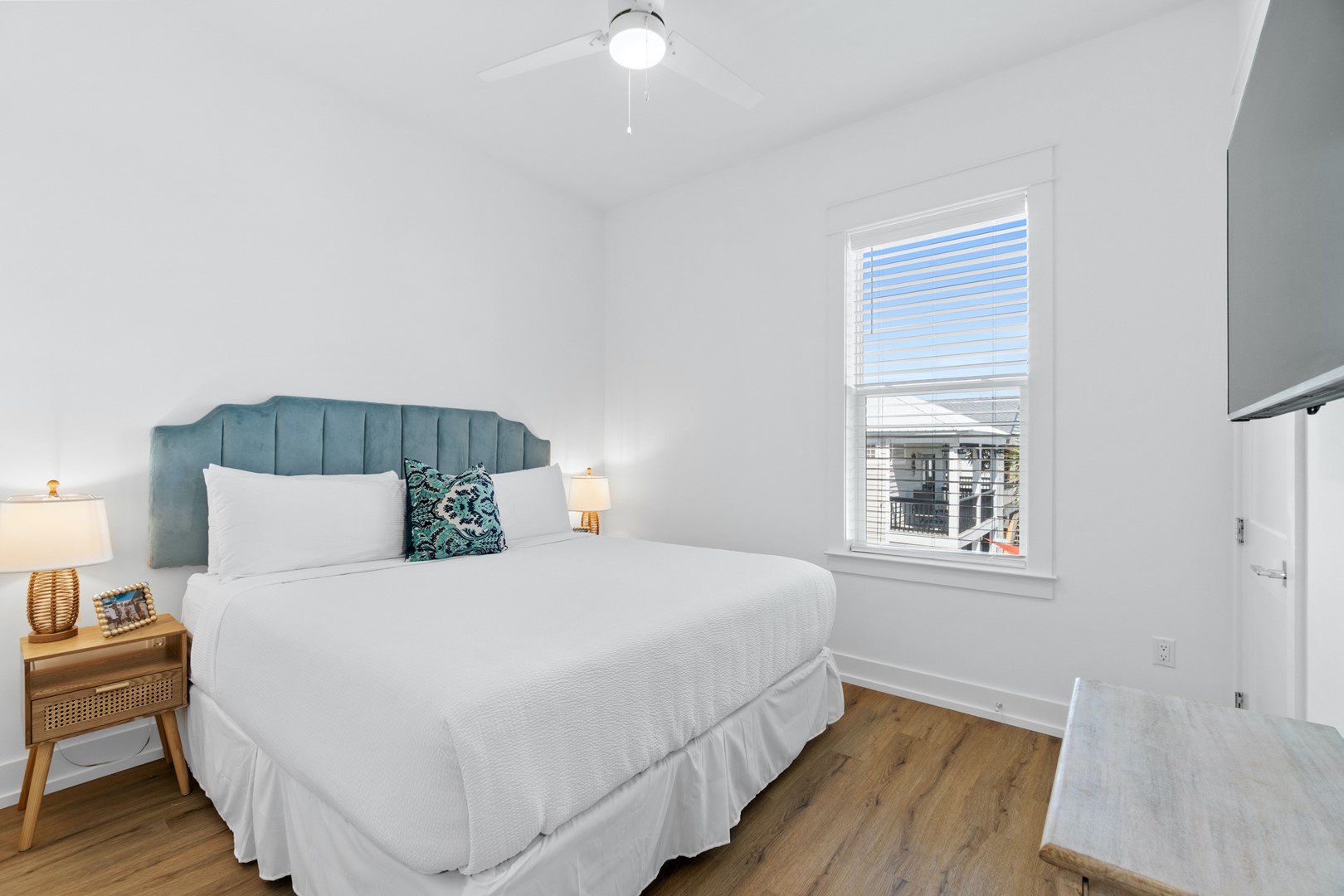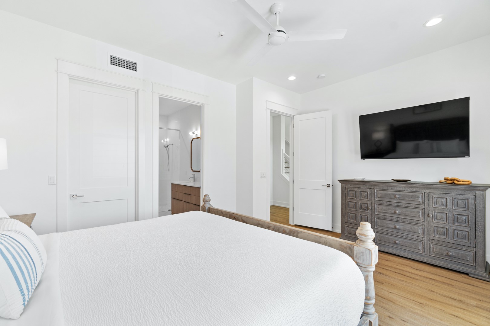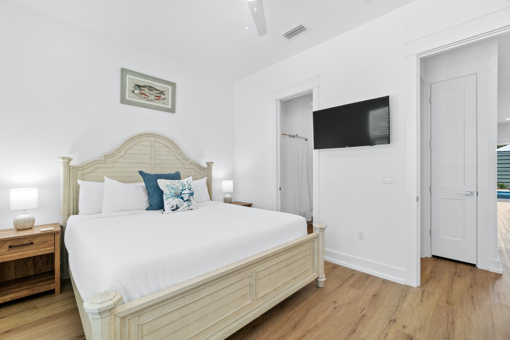 • Bedroom 1 – King bed, Smart TV, spa-inspired en suite bathroom