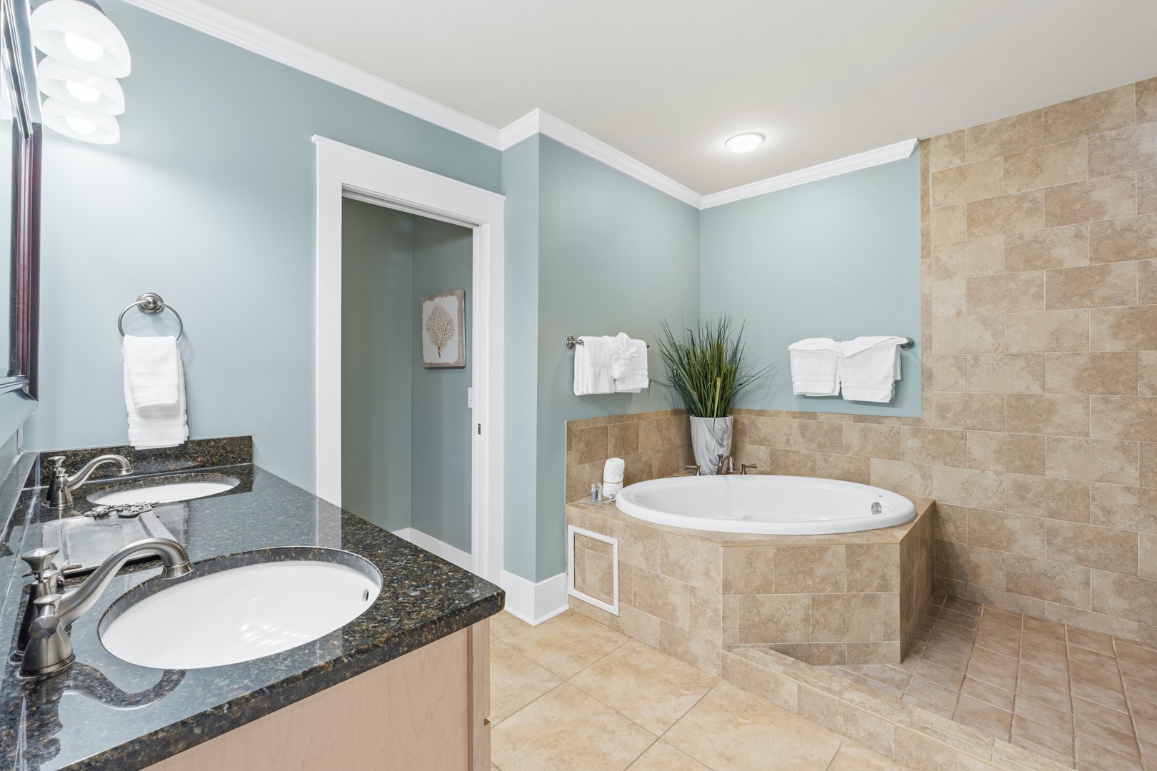 • Bedroom 1: King bed, queen sleeper sofa, TV, en suite bathroom