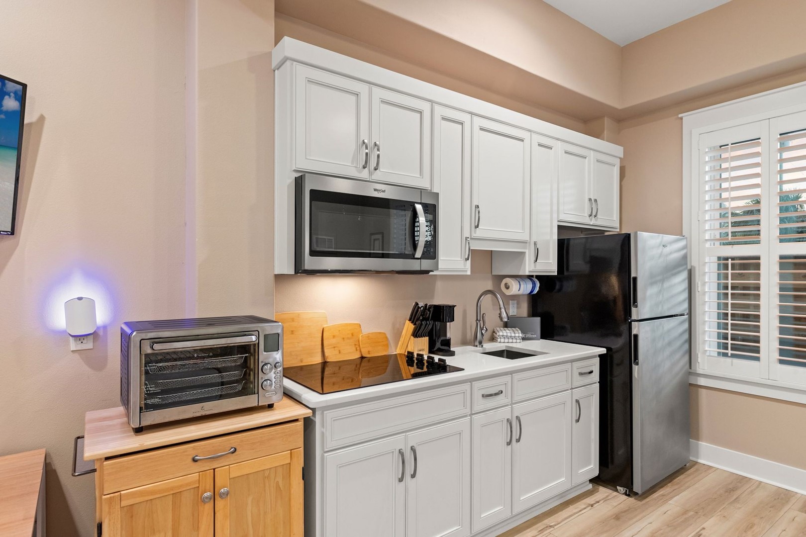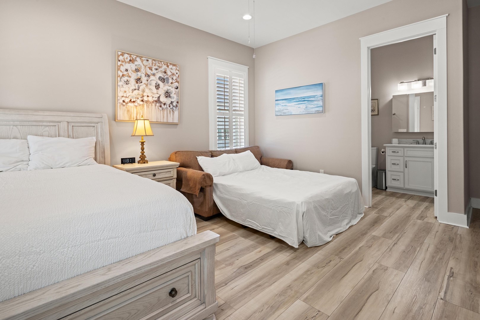 Each bedroom has been carefully curated to provide privacy and comfort, featuring high-quality bedding, Smart TVs, and spa-like en suite bathrooms. The studio suite includes a private kitchenette and a stacking washer and dryer, offering added convenience for extended stays or multi-family groups. Premium amenities such as high-speed Wi-Fi, a washer and dryer, and thoughtful touches throughout ensure a seamless, upscale stay.