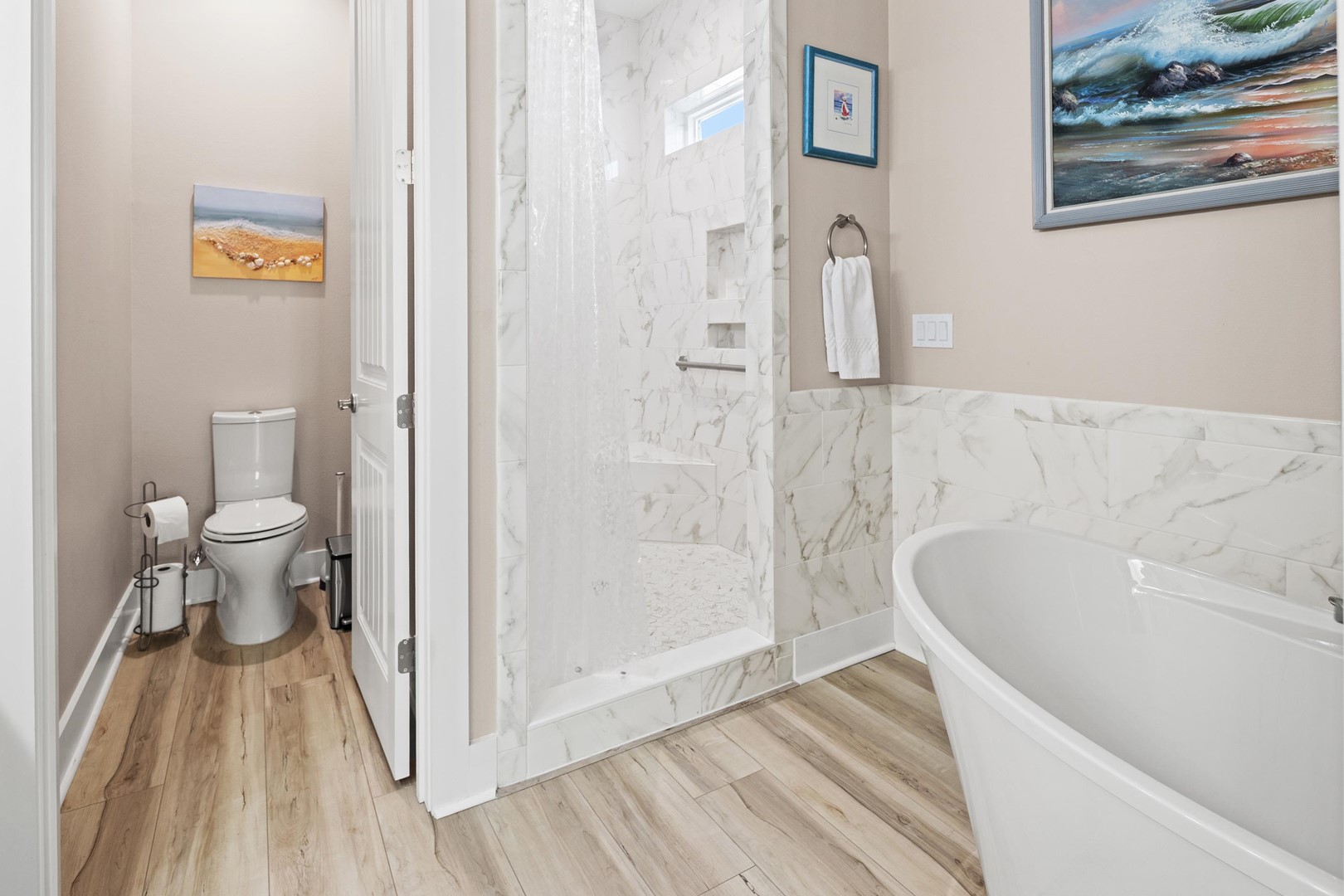 • Bathroom 1: Large Shower with support bars and seating, freestanding bathtub