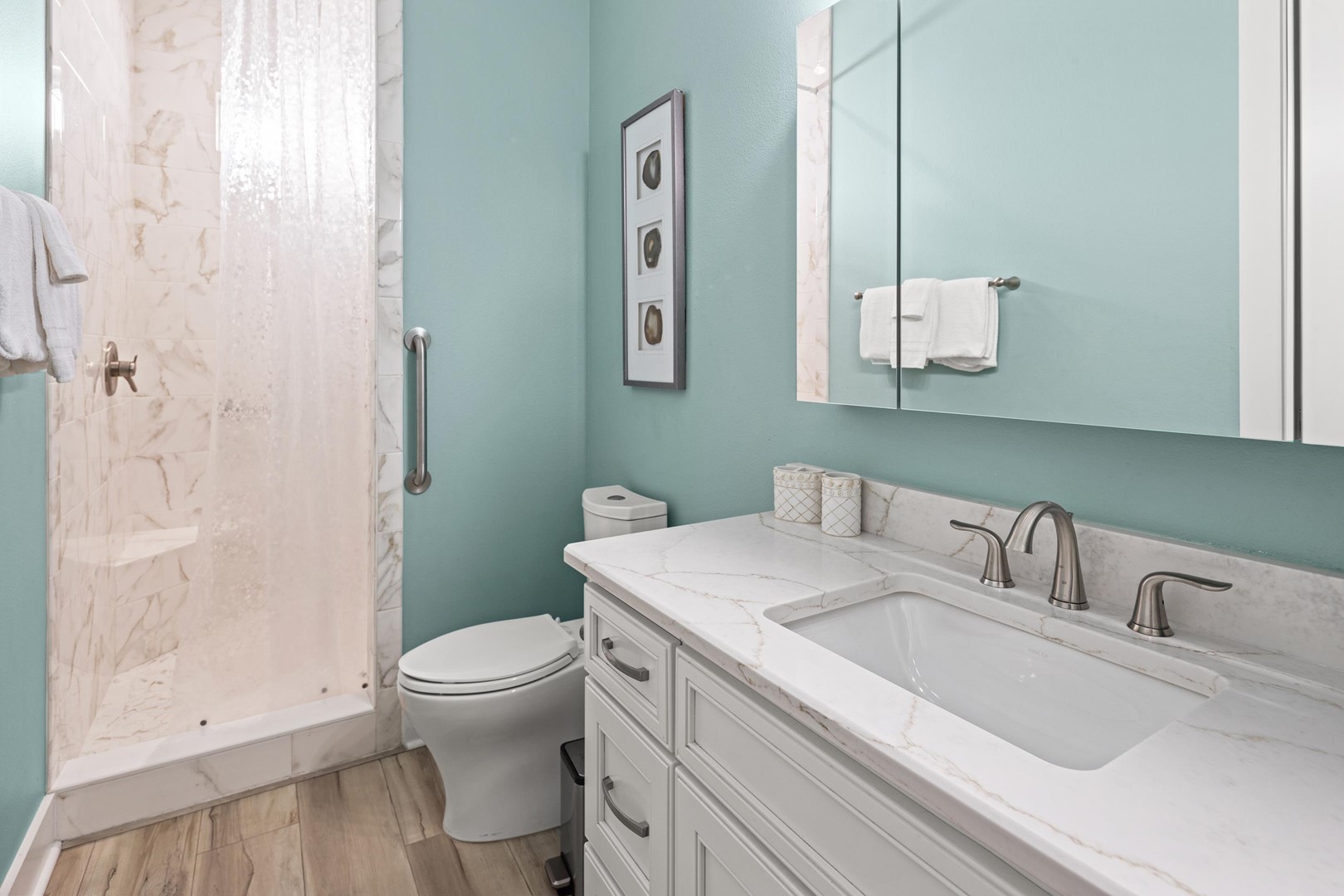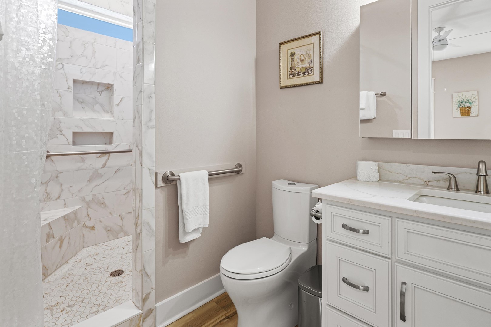 • Bathroom 3: Large Shower with support bars and seating