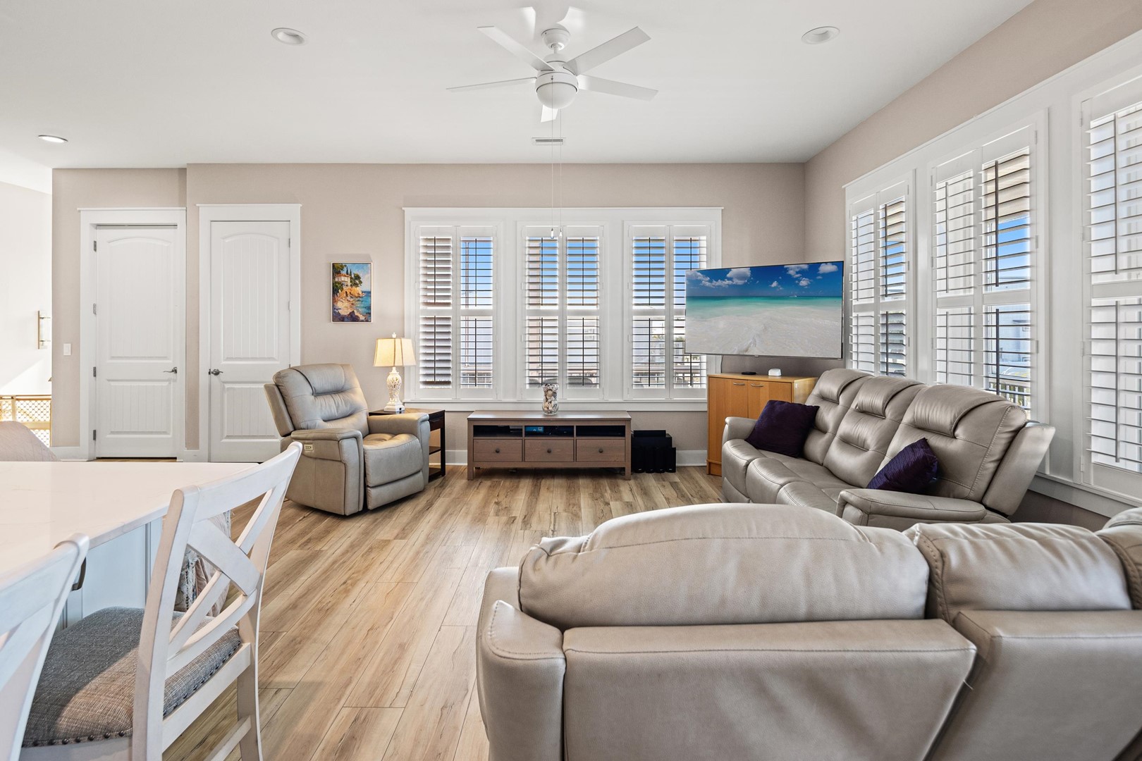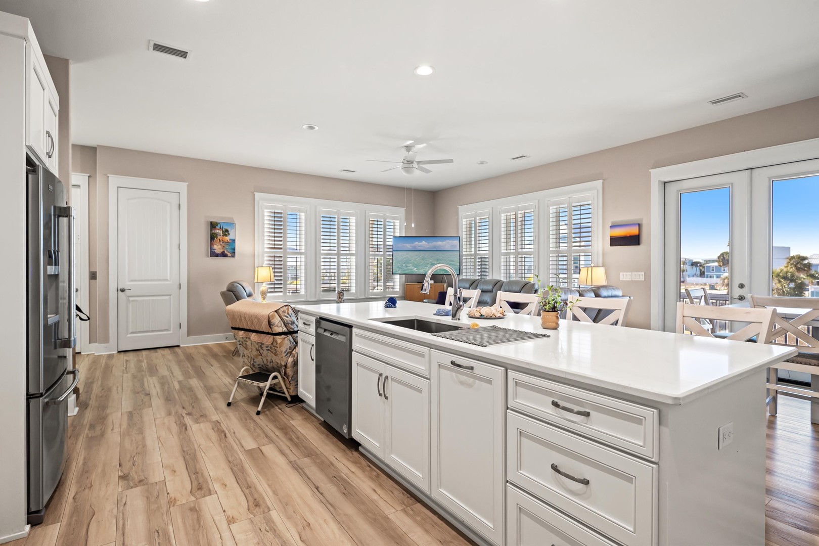 The home features a beautifully appointed open-concept living space, filled with natural light and anchored by a 65" Smart TV and plush seating—perfect for refined relaxation after a day on the coast. The gourmet kitchen is fully equipped with modern appliances, generous counter space, and a breakfast bar, seamlessly flowing into a sophisticated dining area ideal for hosting memorable meals.