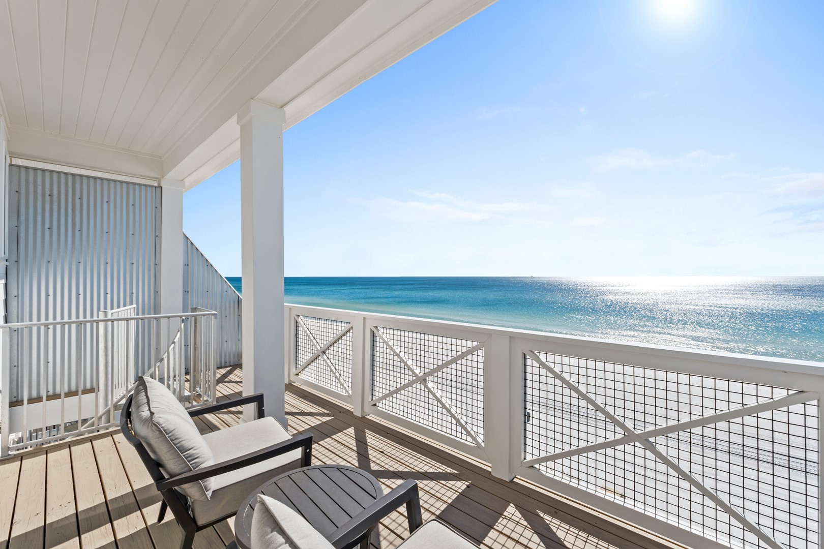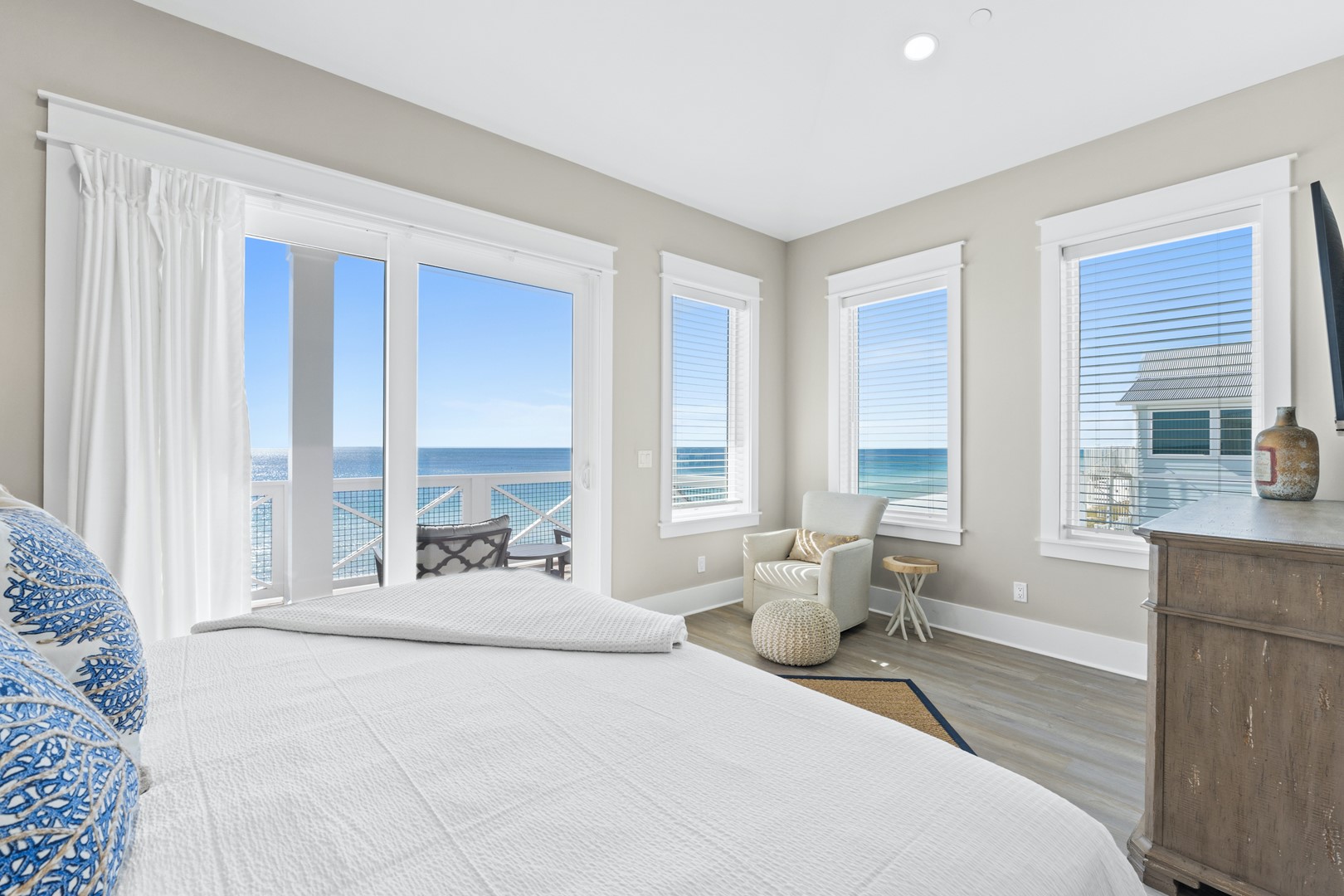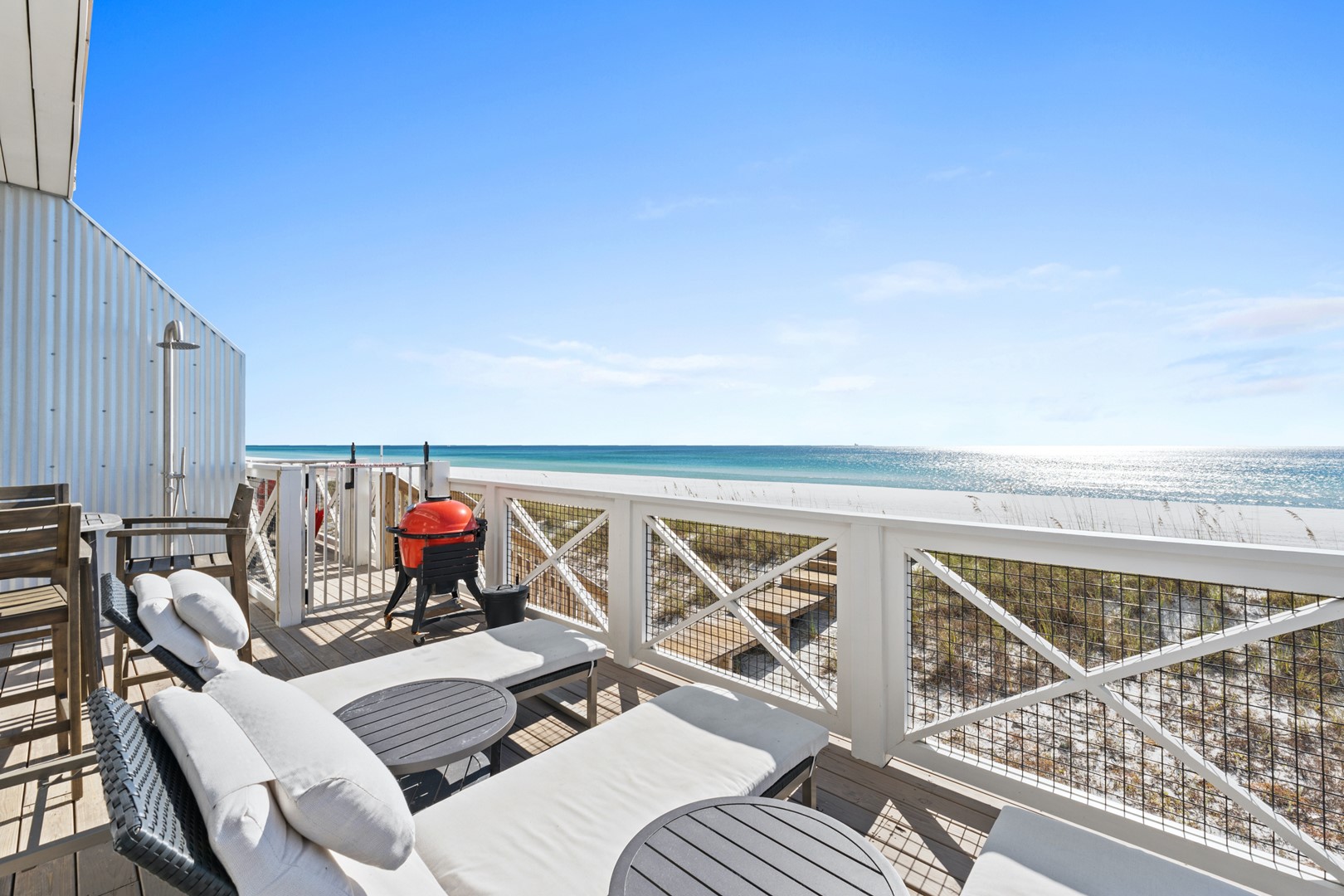 Upstairs, the oversized primary suite offers its own private balcony and panoramic Gulf views stretching east and west. Multiple decks and sitting areas make it easy to gather as a group or unwind with quiet moments by the water.