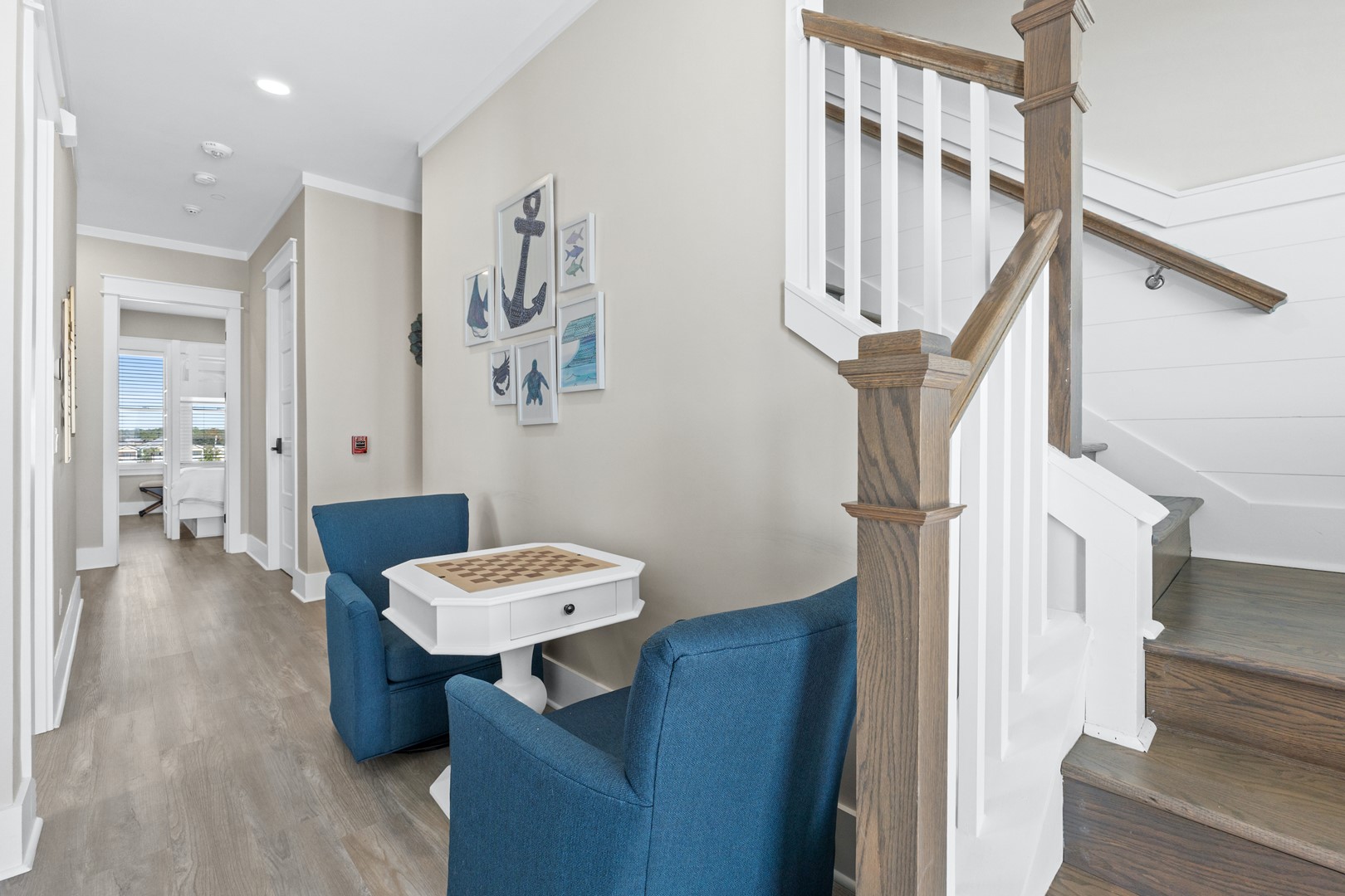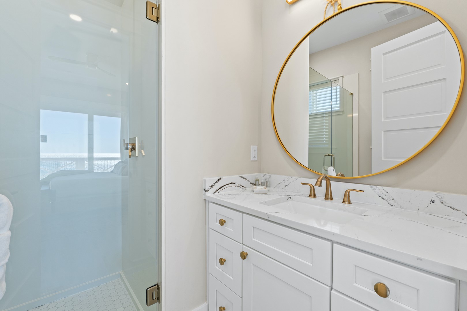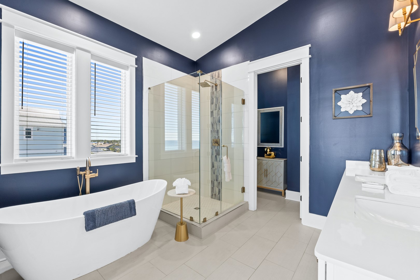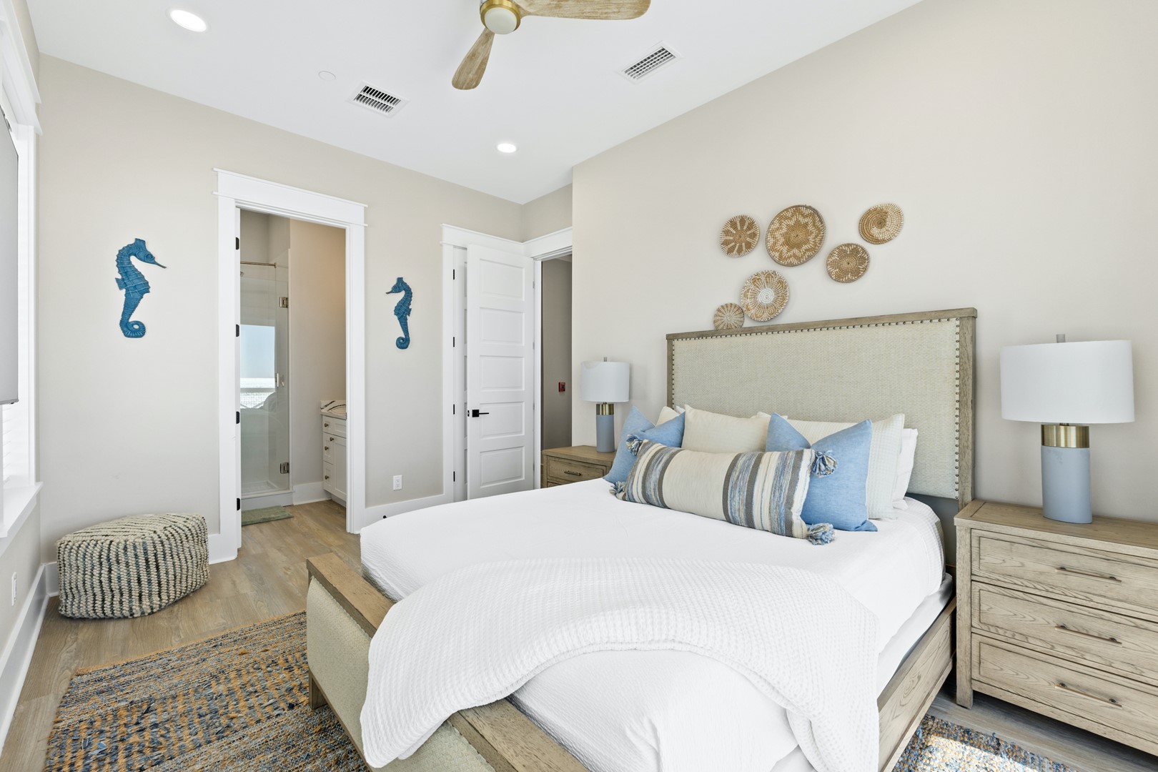 Upstairs, the oversized primary suite offers its own private balcony and panoramic Gulf views stretching east and west. Multiple decks and sitting areas make it easy to gather as a group or unwind with quiet moments by the water.