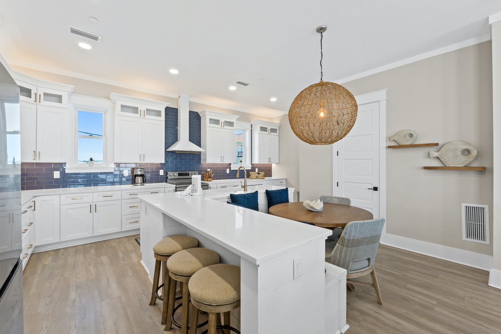 Step inside and find a bright, open layout that brings the Gulf front and center. The gourmet kitchen features quartz countertops, a breakfast bar, and premium appliances, perfect for preparing meals while overlooking the ocean. Enjoy dining with a view, lounging in the spacious living area, or grabbing a drink at the wet bar before stepping out to your private heated pool and direct beach access.