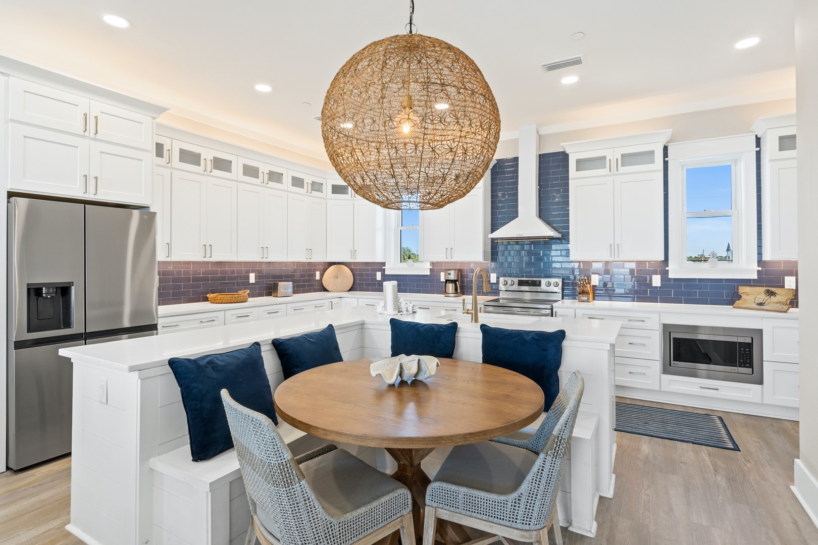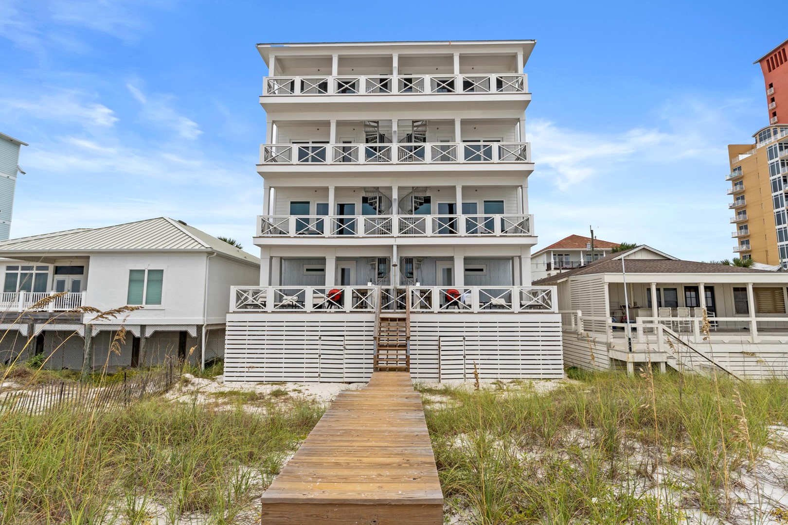 Welcome to Sugar Sands, a luxury beachfront home on Panama City Beach’s iconic sugar-white sands. This five-bedroom, five-and-a-half-bathroom retreat comfortably sleeps 18 guests and combines high-end design with the laid-back charm of the Gulf Coast. From sunrise coffee to sunset cocktails, every room in this home is designed to maximize the breathtaking beach views.
