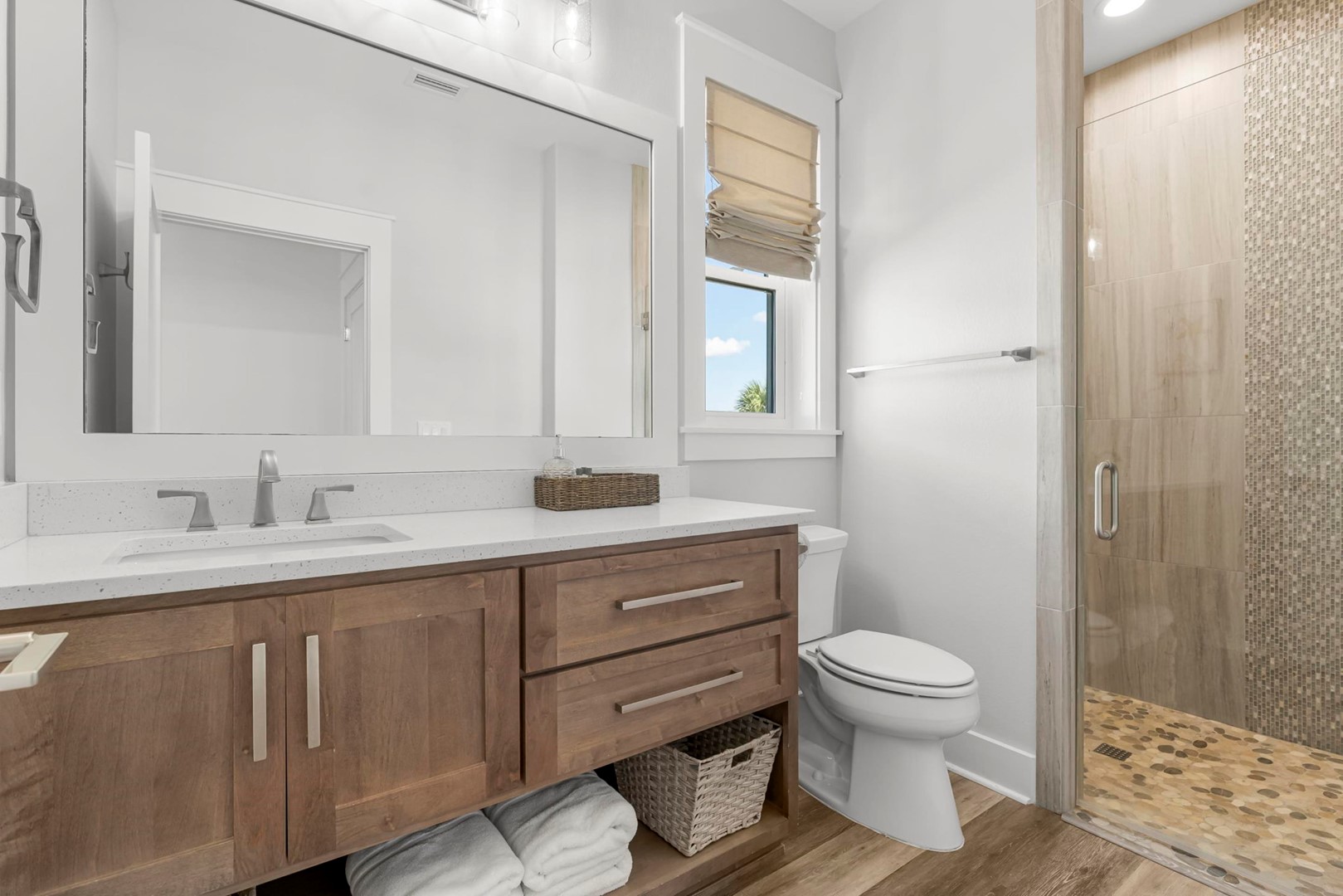 Panhandle Getaways furnishes a few essential items for guests to utilize until they can get to the grocery store. Initial Supplies include: Dishwasher soap, small washing machine powder, each bathroom has amenities (like hotel but NOT restocked) shampoo, conditioner, soap bar. One roll of toilet paper in each bathroom and one paper towel roll in the kitchen. All bed linens and towels are provided. We encourage guests to bring beach towels for use at the pool and beach.