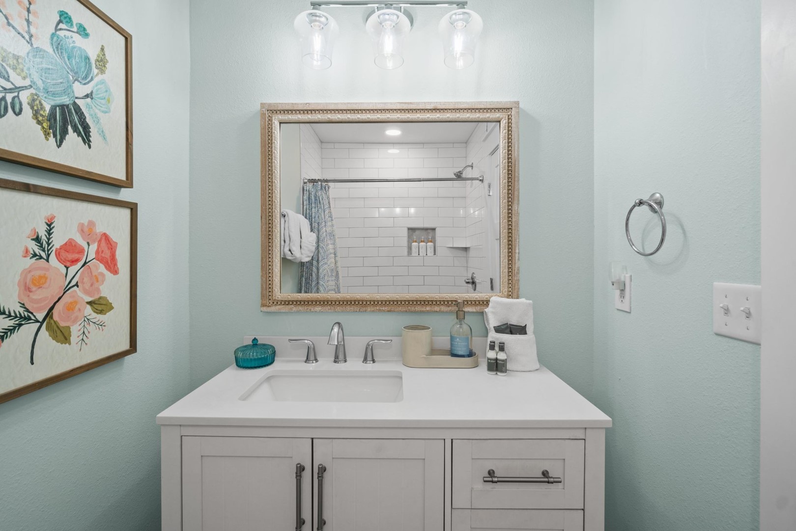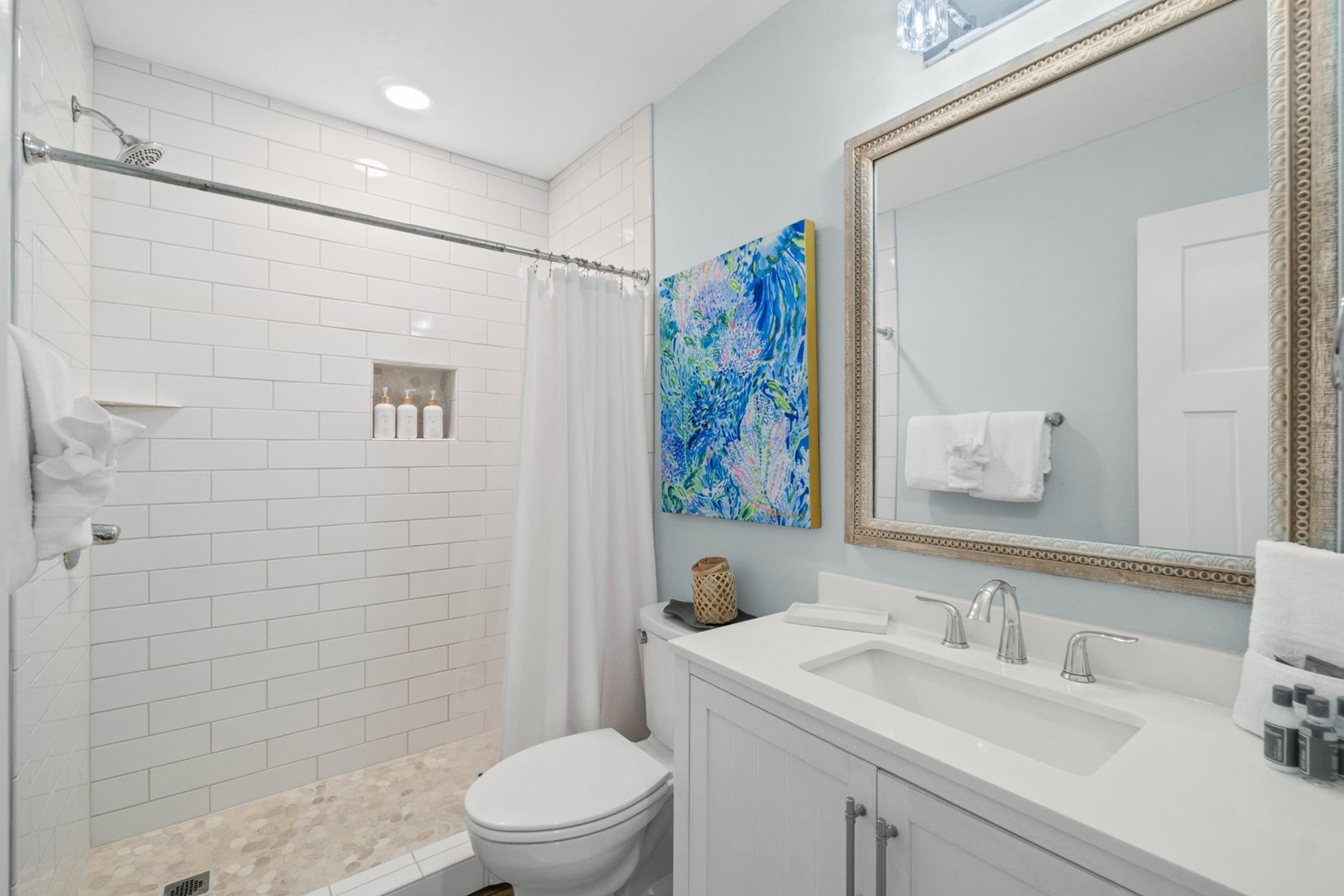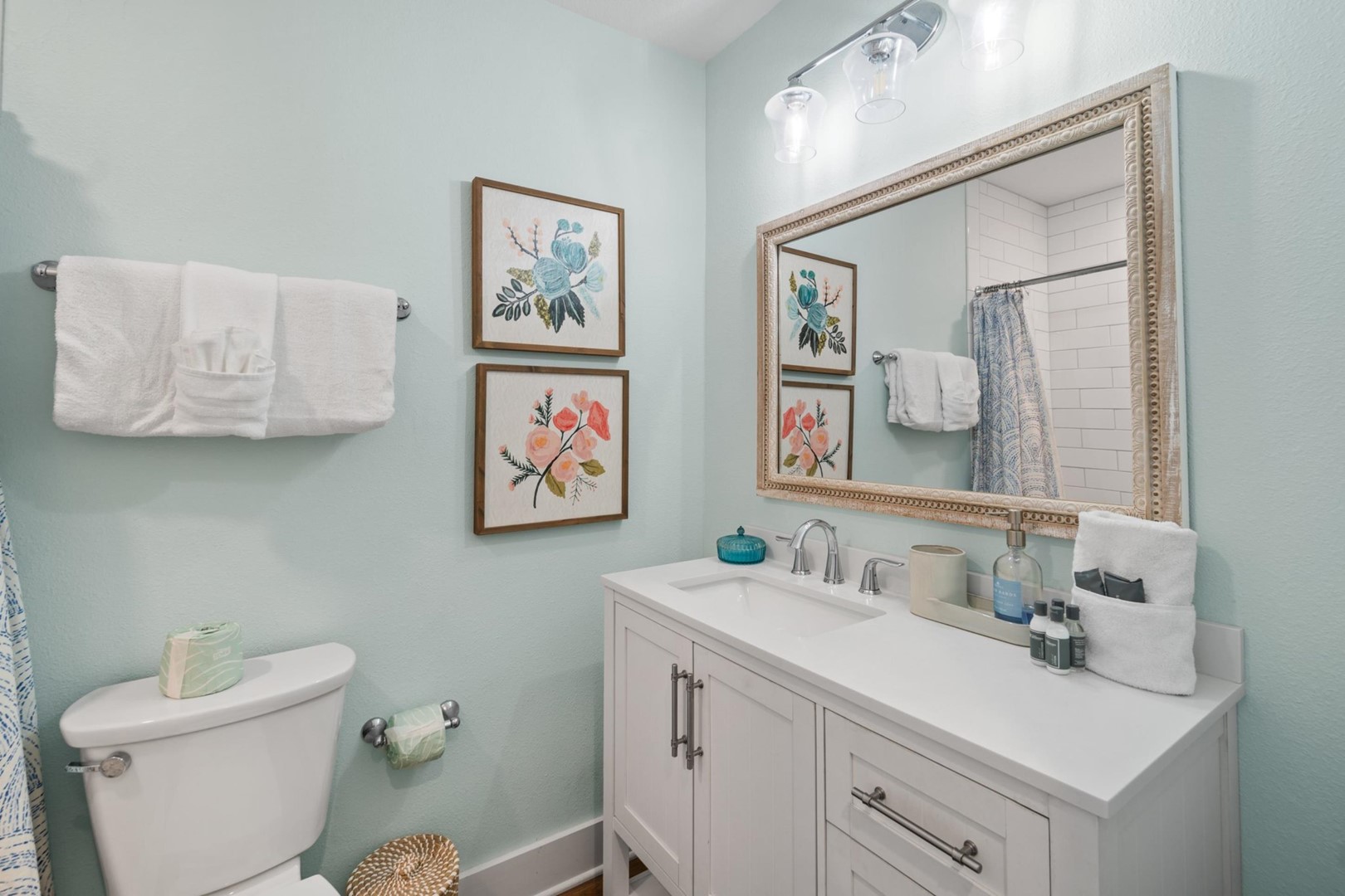 Panhandle Getaways furnishes a few essential items for guests to utilize until they can get to the grocery store. Initial Supplies include: Dishwasher soap, small washing machine powder, each bathroom has amenities (like hotel but NOT restocked) shampoo, conditioner, soap bar. One roll of toilet paper in each bathroom and one paper towel roll in the kitchen. All bed linens and towels are provided. We encourage guests to bring beach towels for use at the pool and beach.
