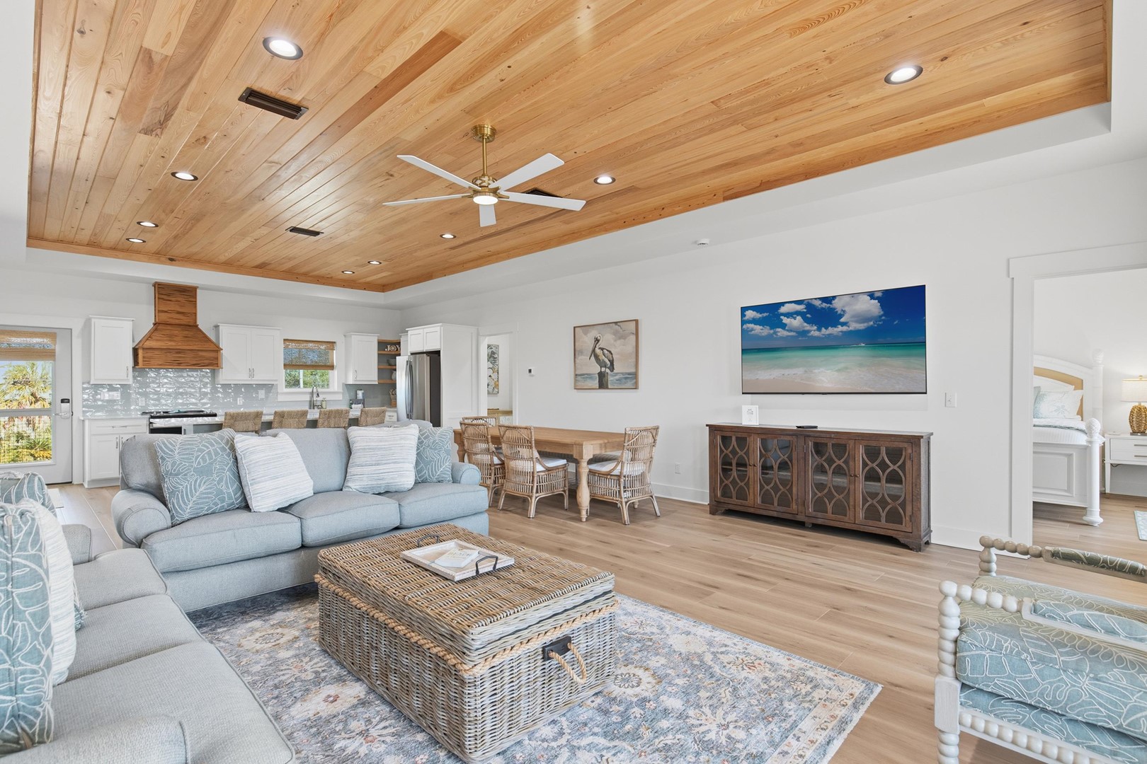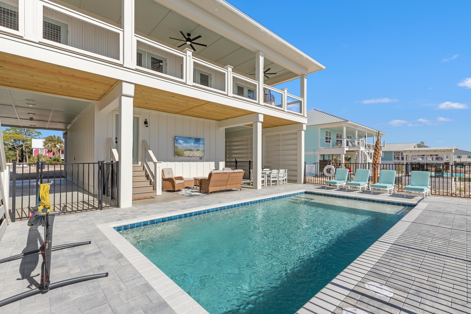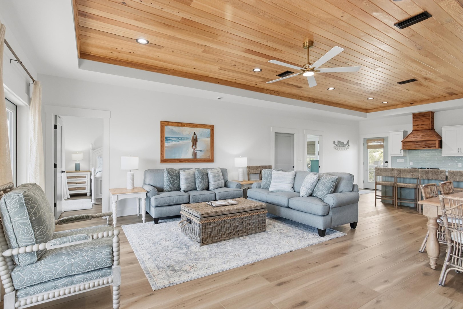 Welcome to Walking on Water, a 4-bedroom, 4-bathroom beach house in St. George Island, Florida by Panhandle Getaways. Perfect for families or groups, this beautifully designed coastal retreat features an open living area with a 70" Smart TV, a fully equipped kitchen with breakfast bar, and a spacious deck overlooking your private saltwater pool. Just steps from the beach, this home combines the best of island living with comfort, style, and relaxation.