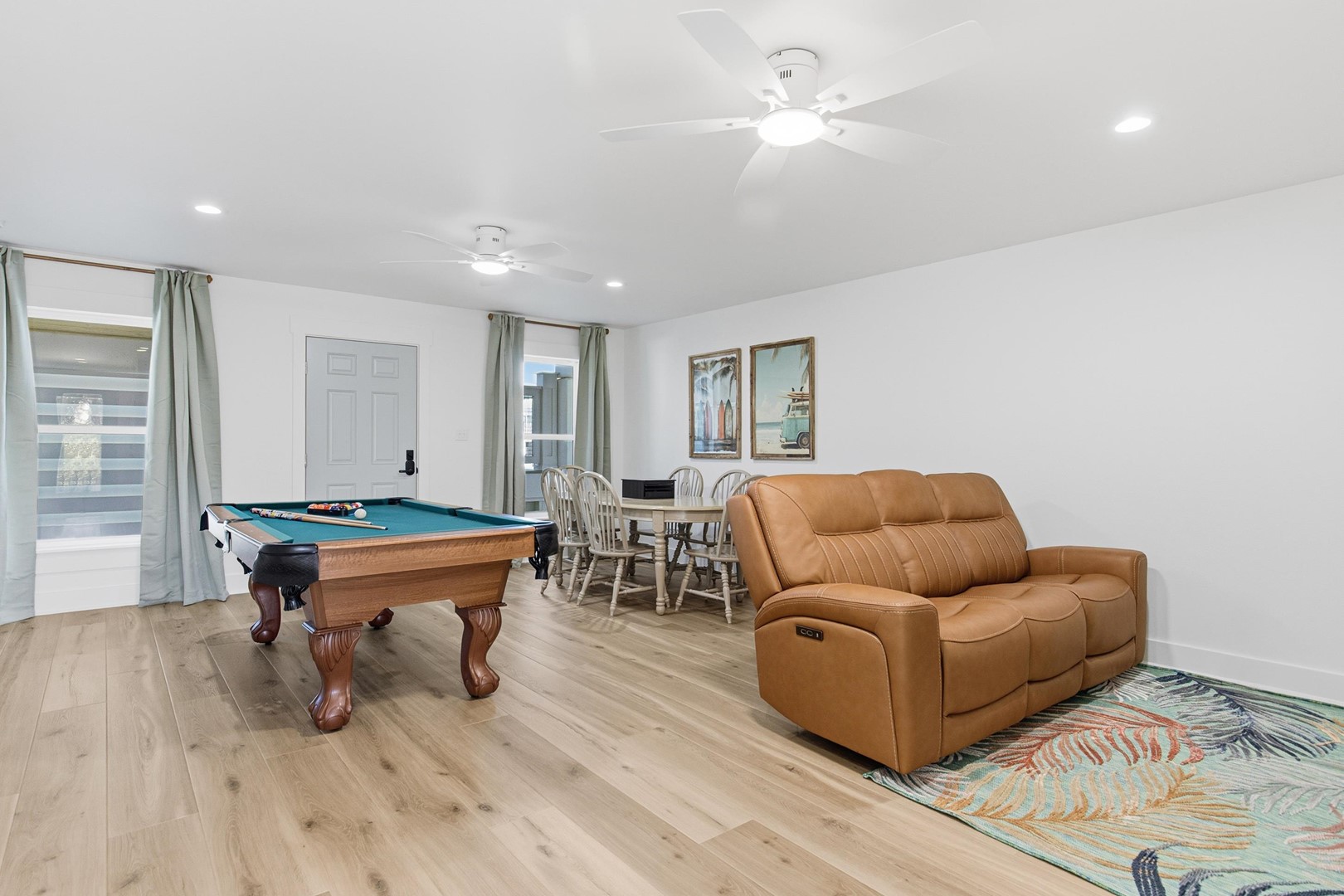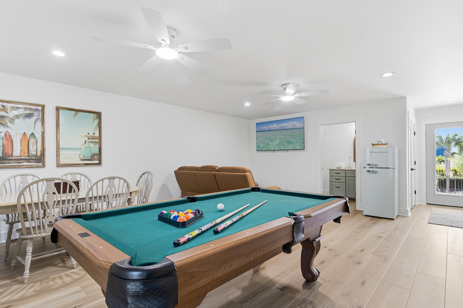 • Recreation room with pool table, Smart TV, seating, and a refrigerator