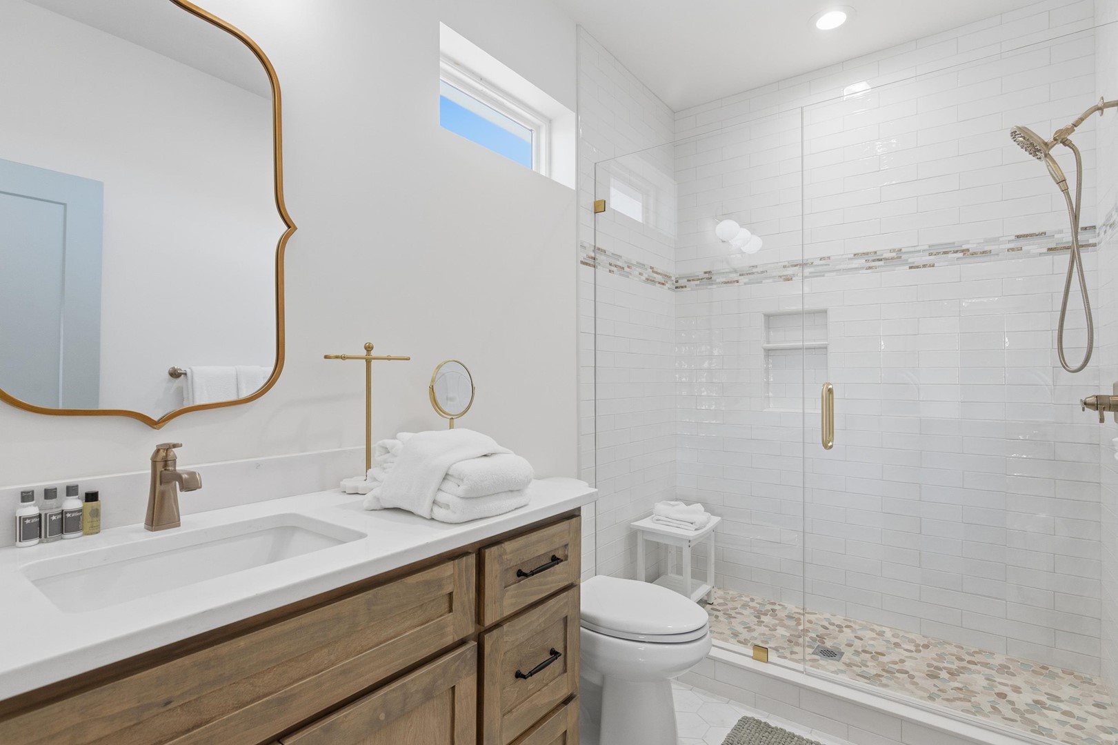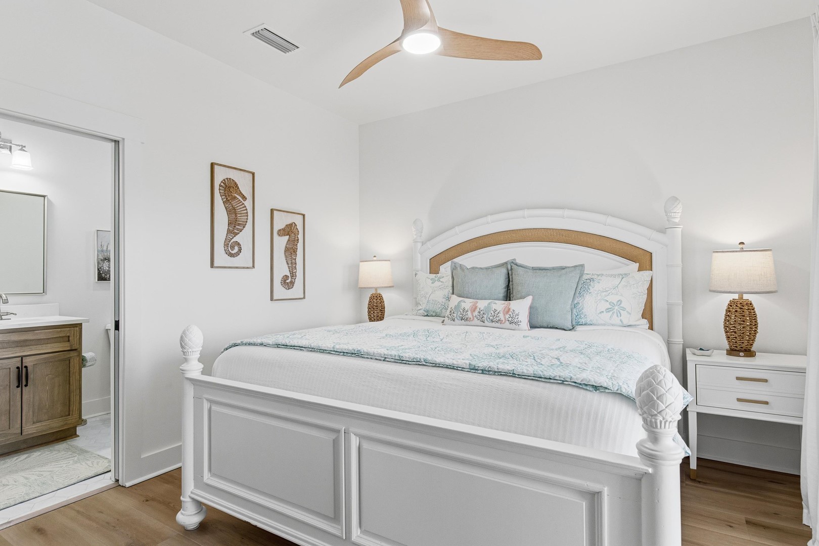 • Bedroom 2 (Primary Suite): King bed, 50" Smart TV, en suite bathroom