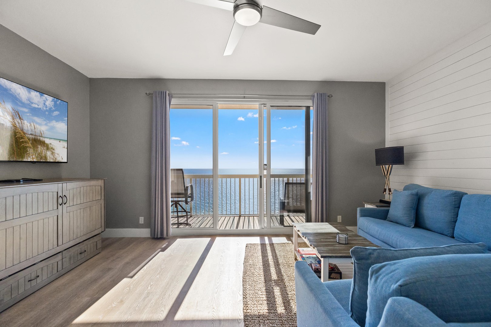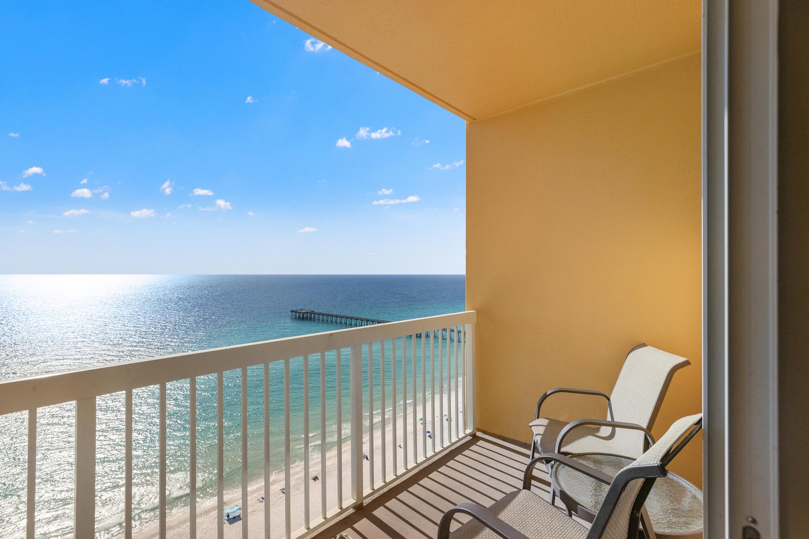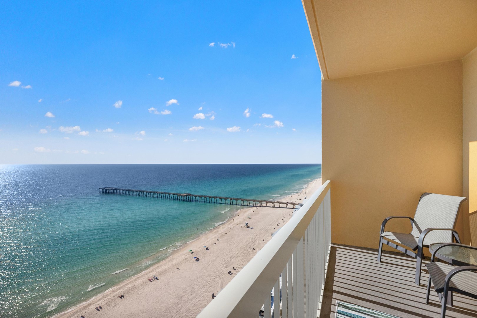 Calypso Resort 2007W by Panhandle Getaways is a beachfront condo in Panama City Beach, FL, featuring stunning Gulf views from a private balcony and resort amenities including two beachfront pools, a tiki bar, and a fitness center.