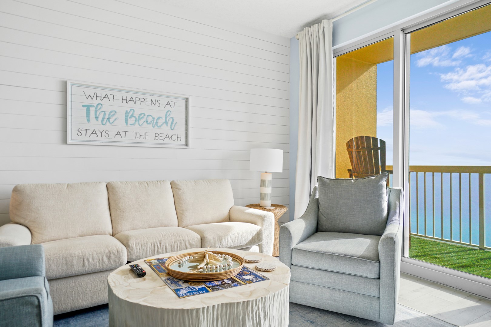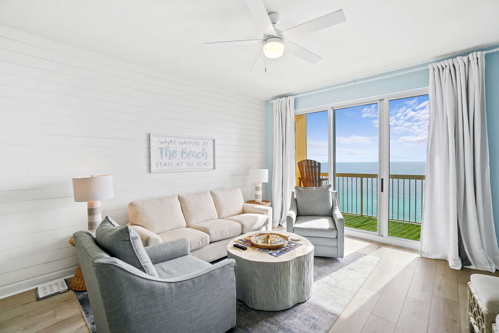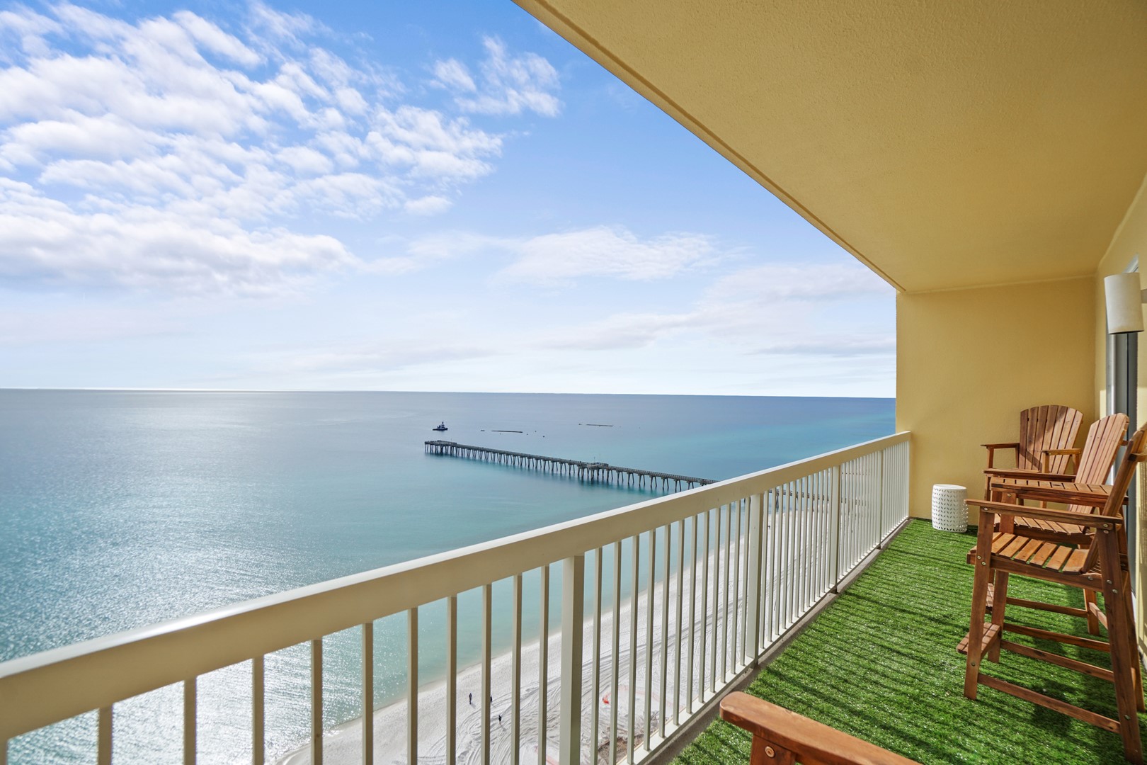 The balcony has turf which is easy on the feet and the view from the balcony is expansive. Enjoy sunrises and sunsets every morning/evening or watch the fireworks on NYE or July 4th. It’s the perfect spot! Due to adding captain chairs you will have no problem with the balcony railing obstructing your view.