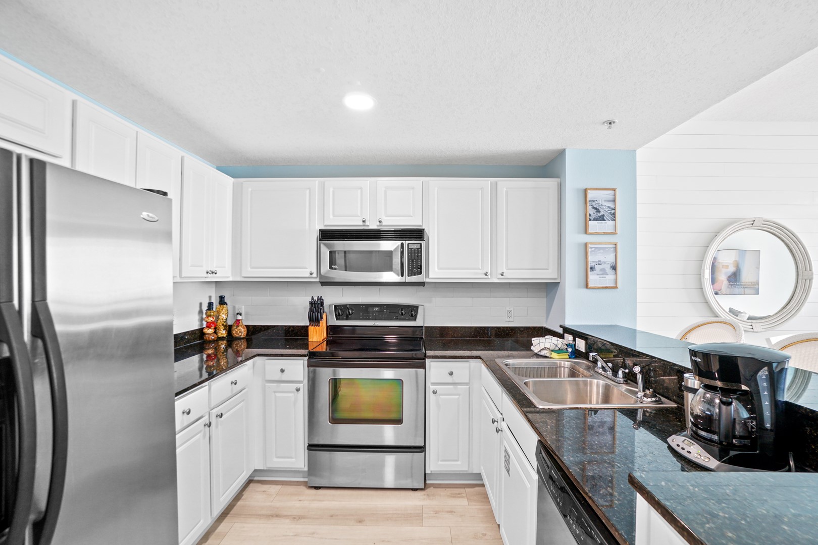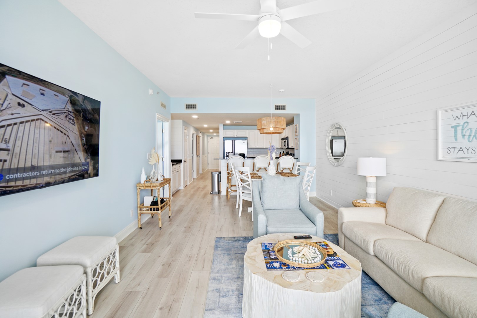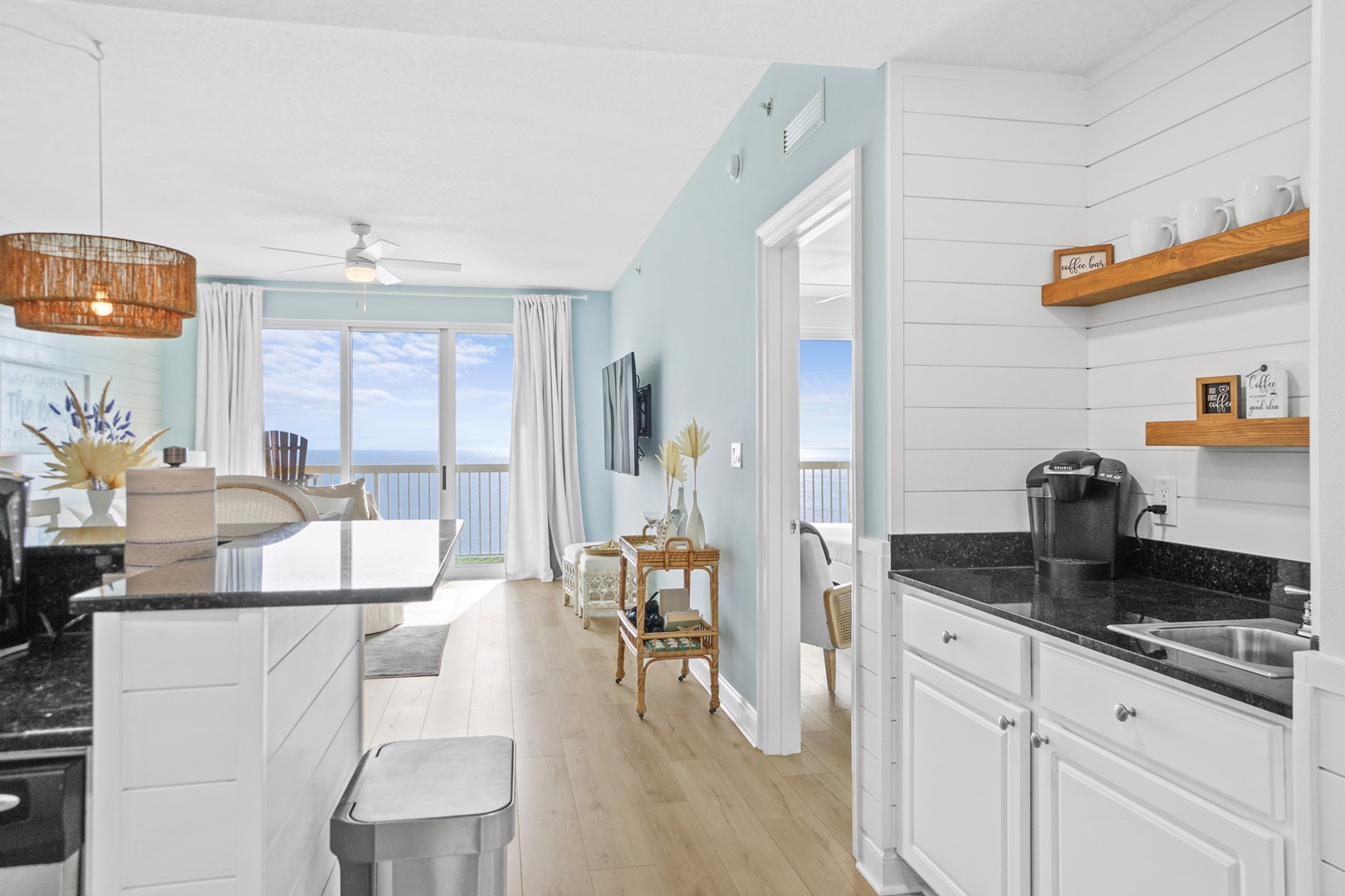 Guests will enjoy luxury flooring, paint, recessed lighting, shiplap throughout the entire condo, added built-in shelving on the wet bar, new 65” smart TV’s in the living room and master bedroom, and a 55” smart TV in the spare bedroom. Every room has a TV! This is the only unit in the building with double vanities in BOTH bathrooms which is ideal for big families, multi-couple trips, or even groups of friends staying at the unit. The master bathroom has a completely new walk-in shower, tiled from floor to ceiling.