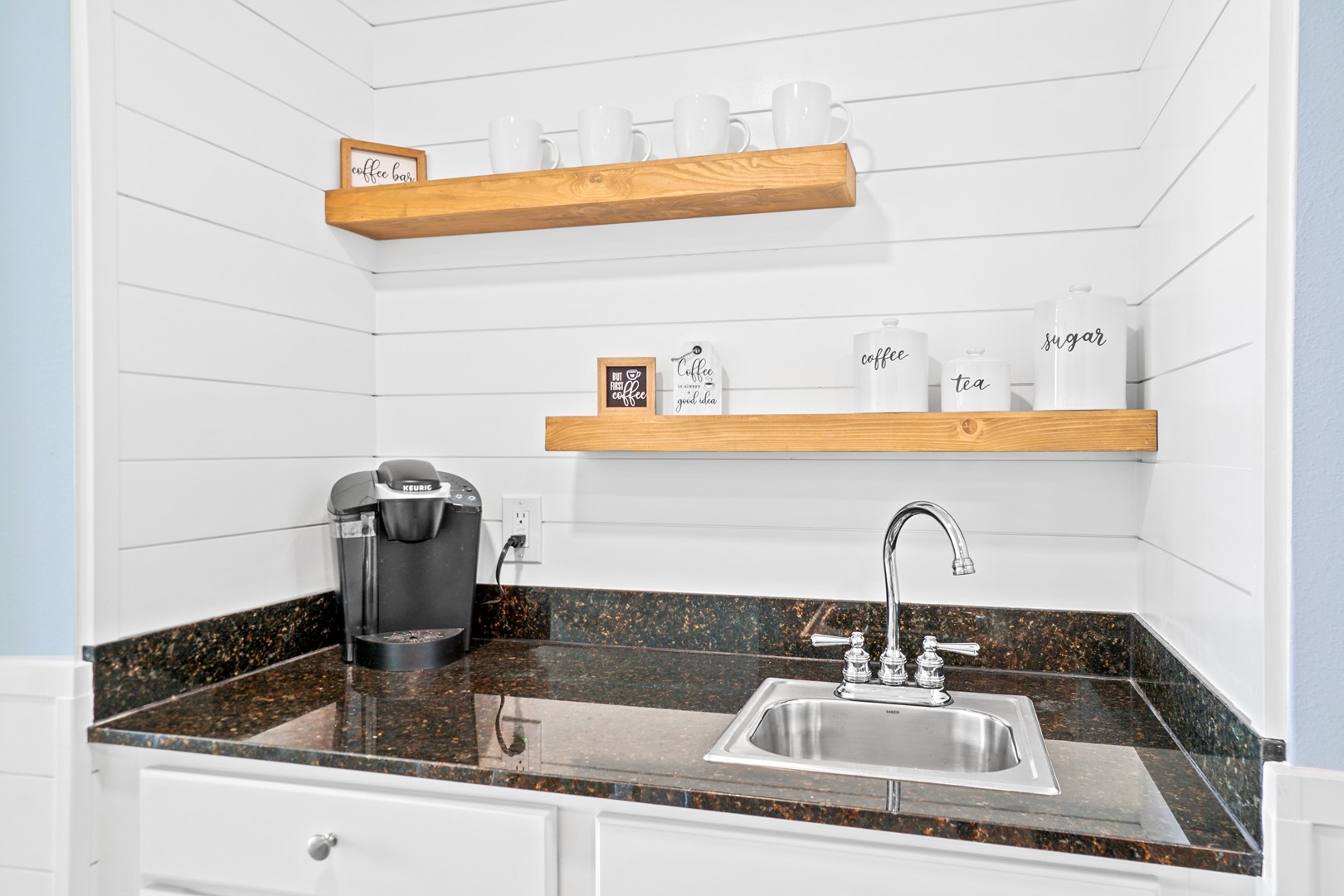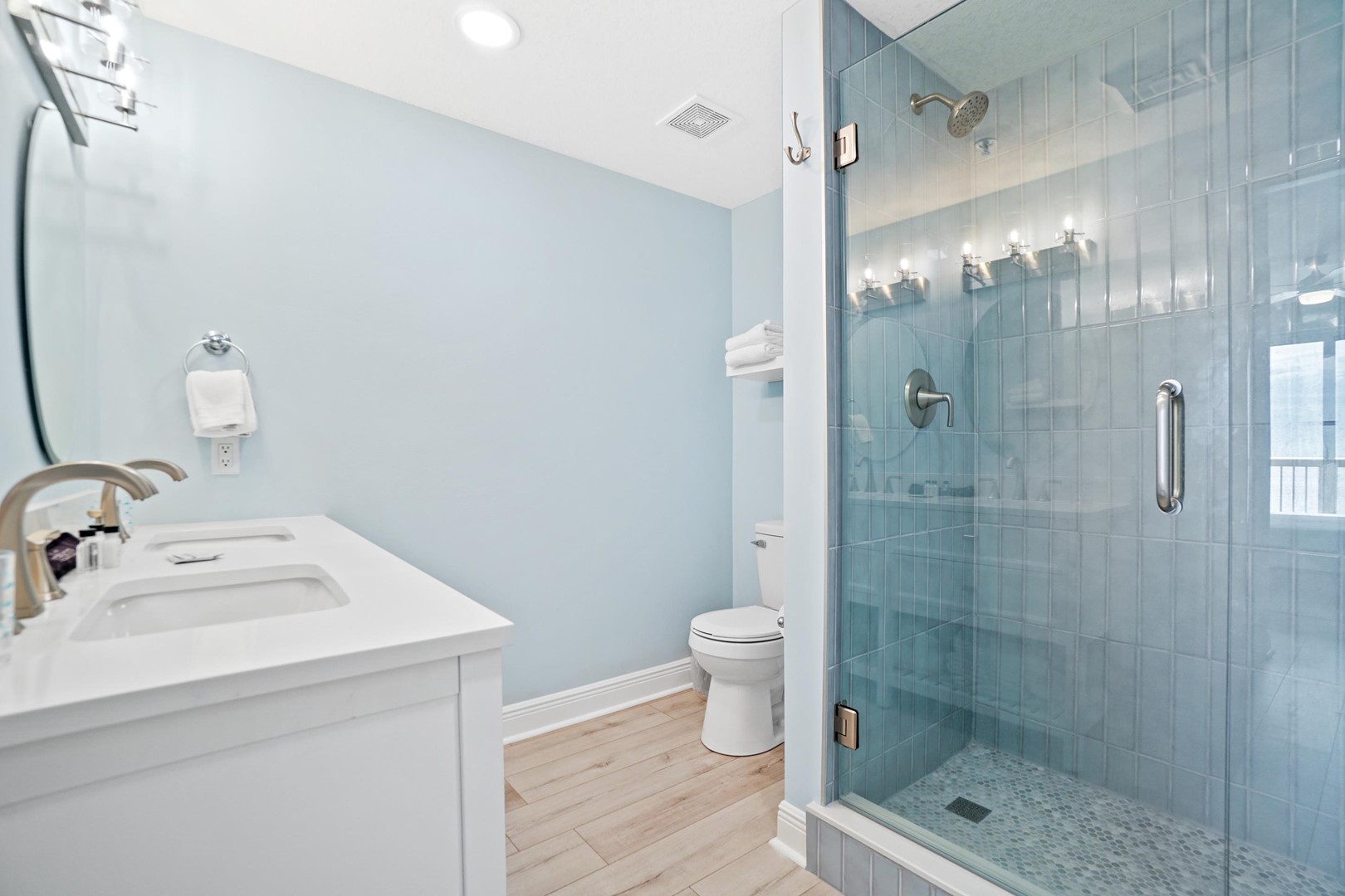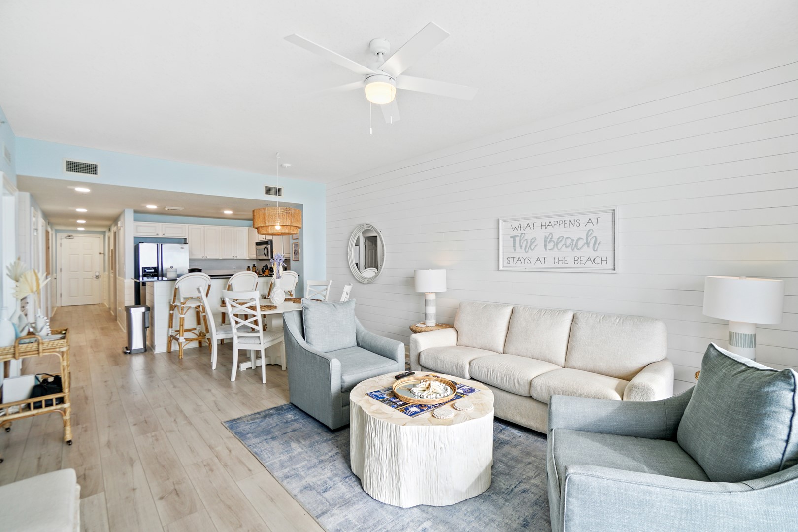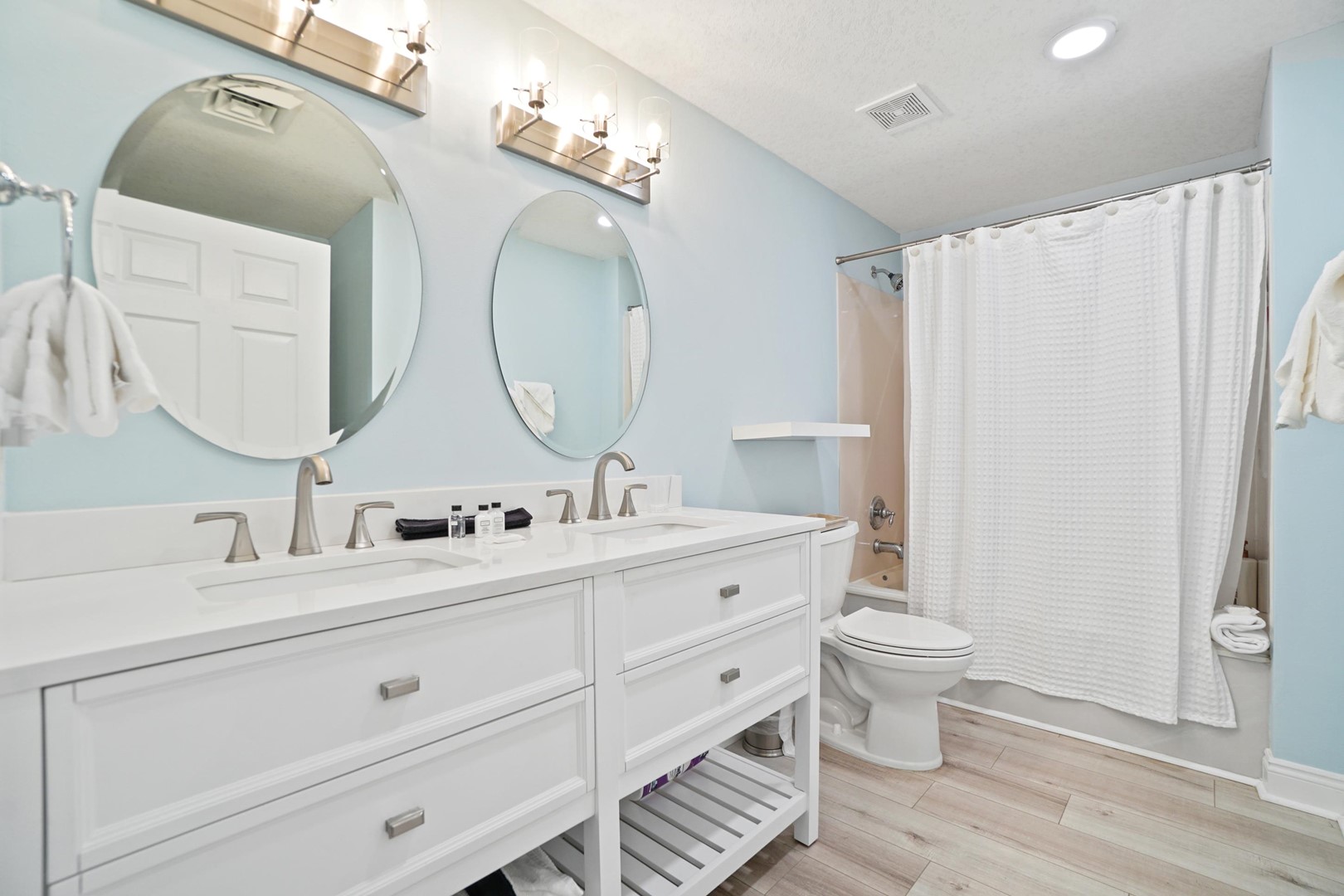 Guests will enjoy luxury flooring, paint, recessed lighting, shiplap throughout the entire condo, added built-in shelving on the wet bar, new 65” smart TV’s in the living room and master bedroom, and a 55” smart TV in the spare bedroom. Every room has a TV! This is the only unit in the building with double vanities in BOTH bathrooms which is ideal for big families, multi-couple trips, or even groups of friends staying at the unit. The master bathroom has a completely new walk-in shower, tiled from floor to ceiling.