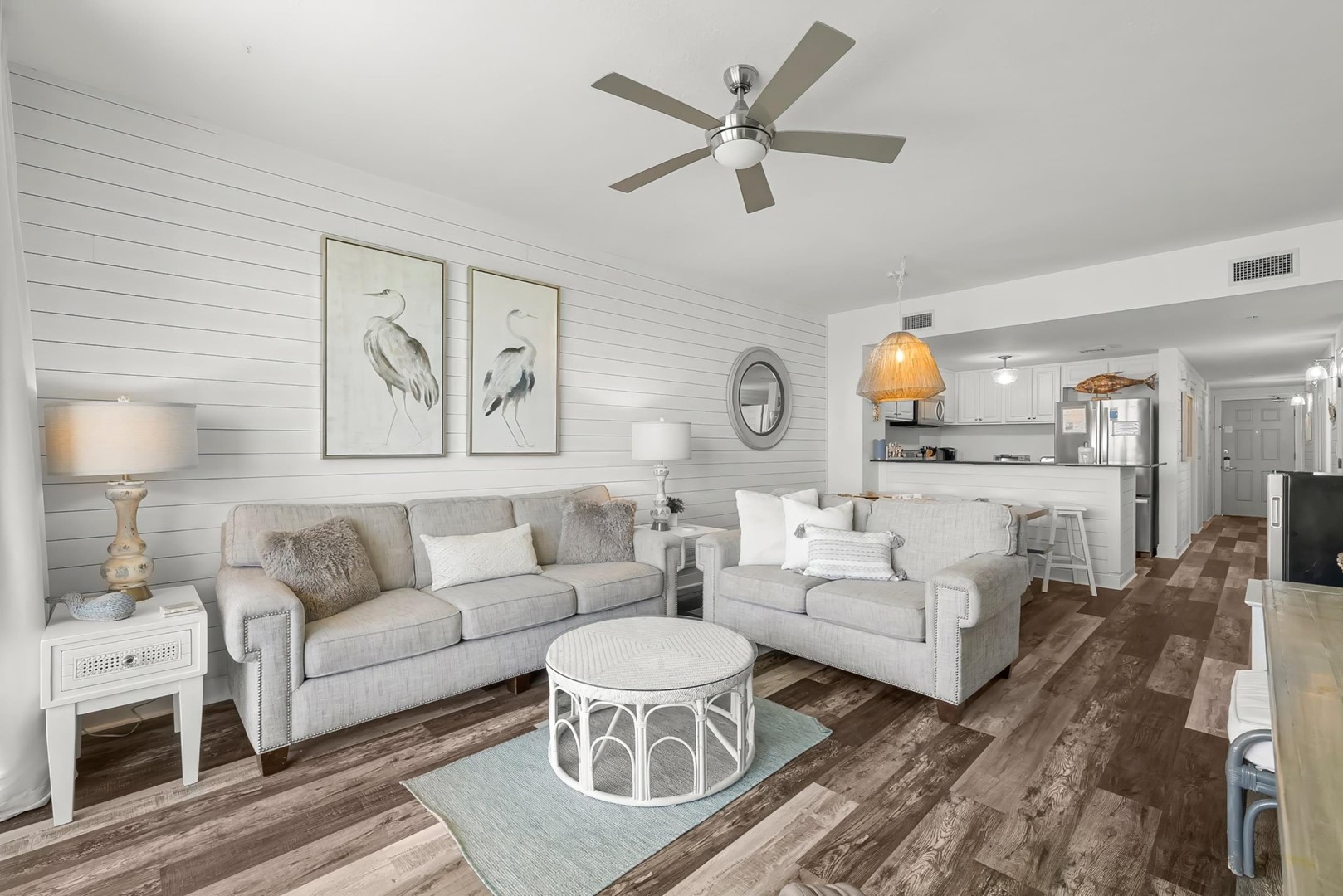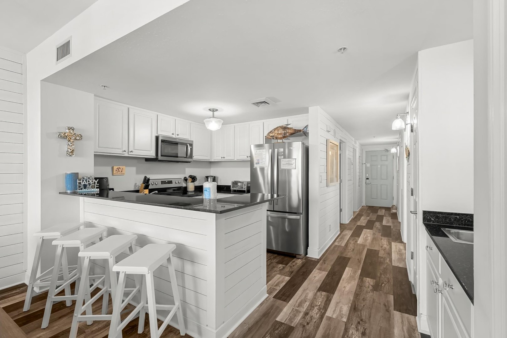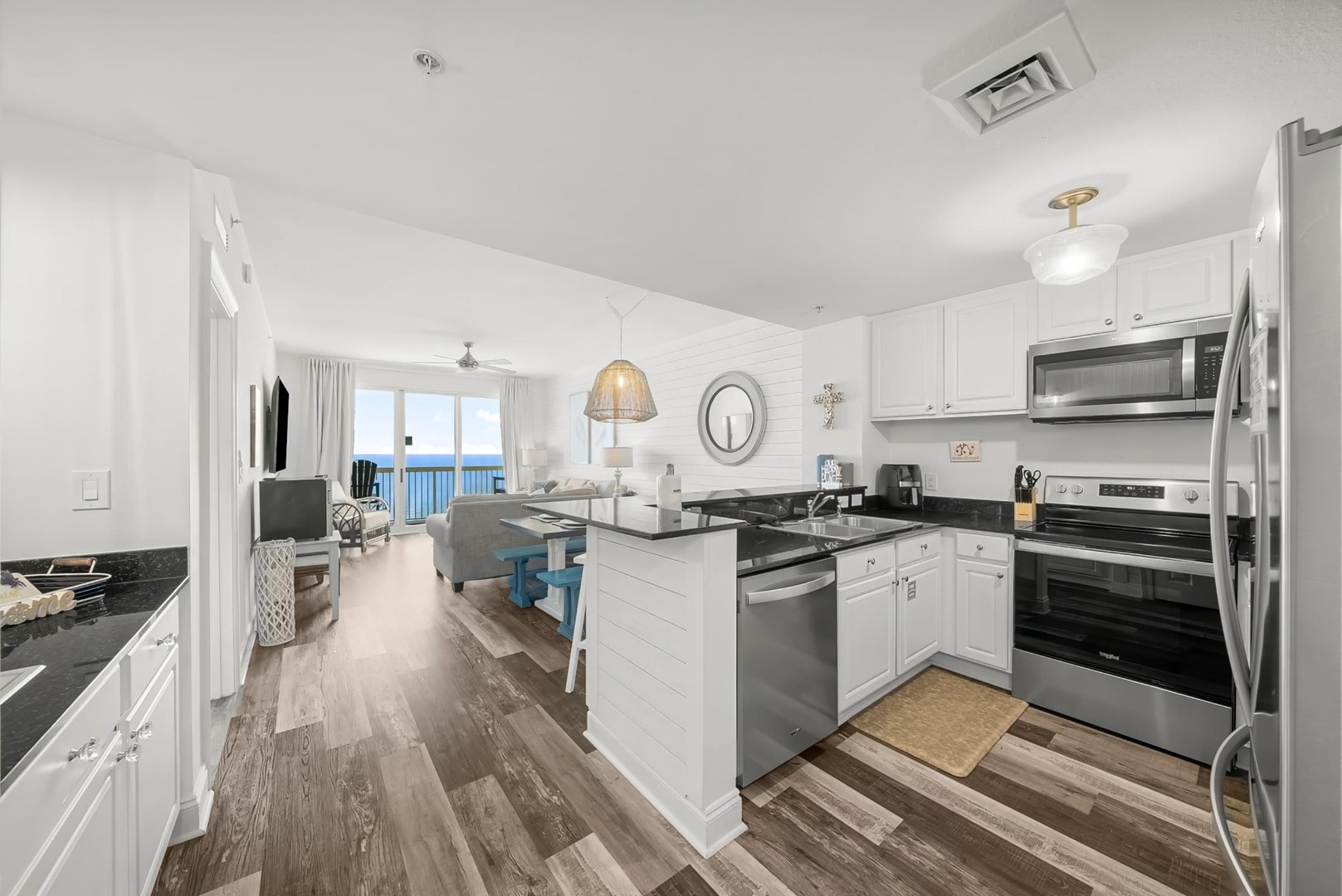 Coastal dĂ©cor done by our designer including new furnishings & light fixtures that are fresh and modern- beckoning one to unpack and stay a while.Â