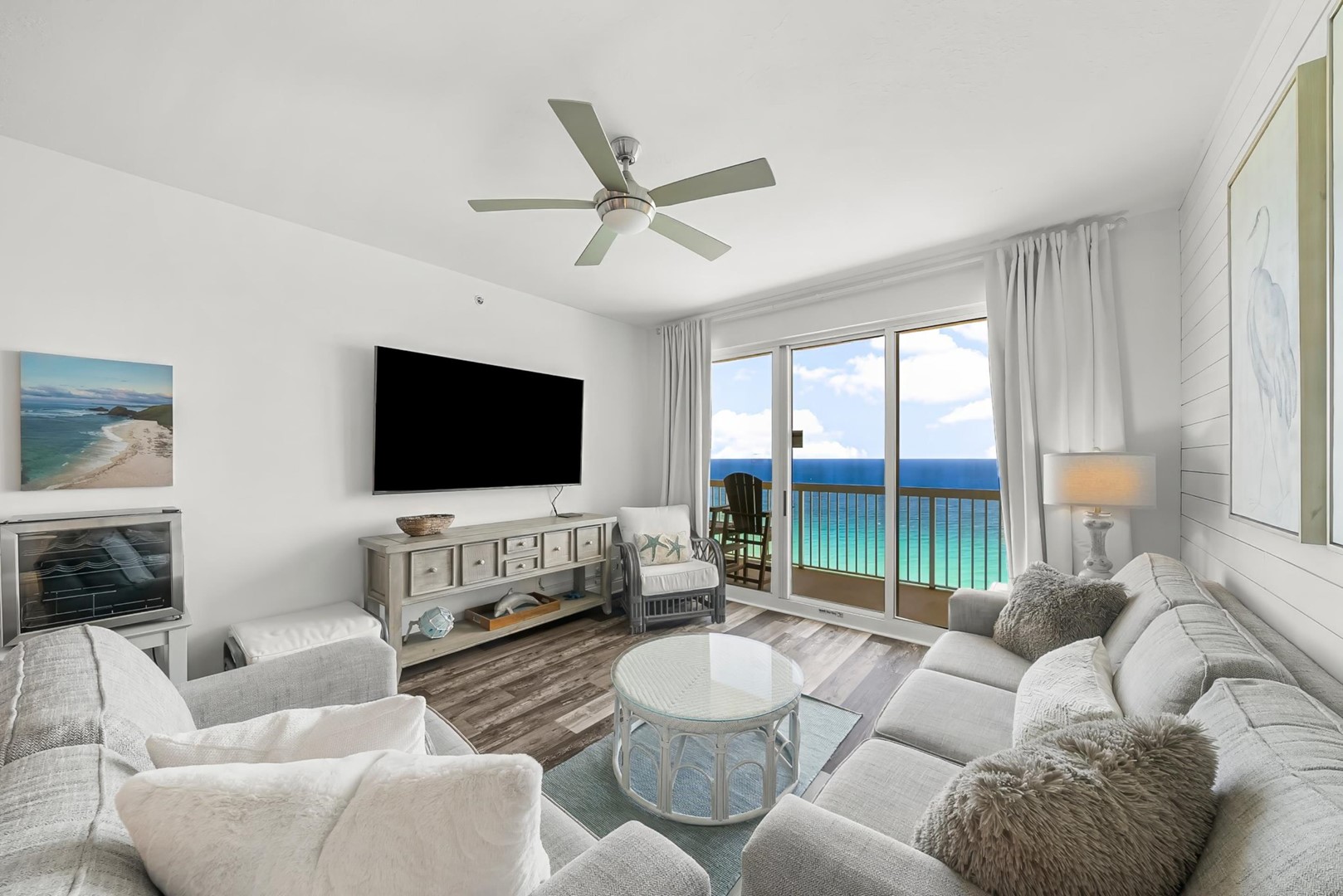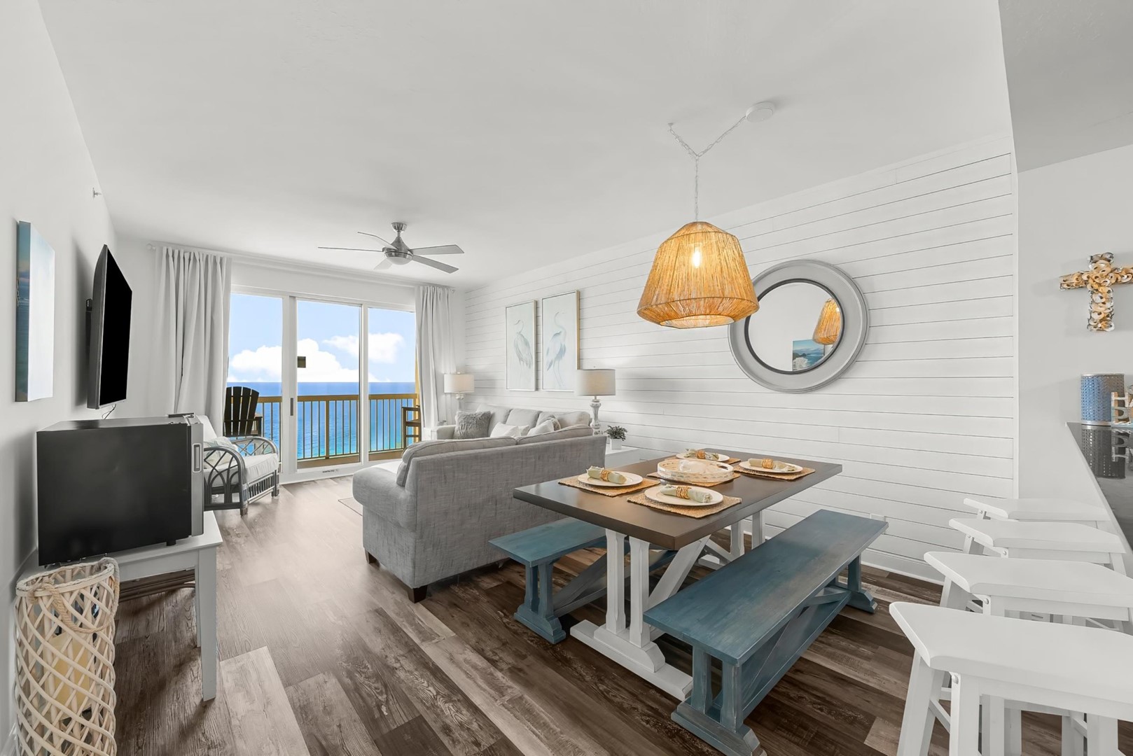Gather and rest after a day at the beach or pool- the well-stocked kitchen has everything needed to stay in and enjoy a meal at “home”, or take advantage of the perfect location and walk to restaurants and Pier Park shopping & entertainment.Â