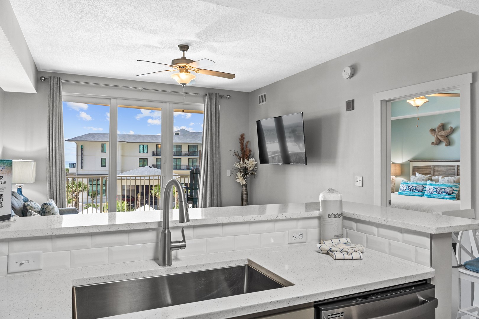 Panhandle Getaways furnishes a few essential items for guests to utilize until they can get to the grocery store. Initial Supplies include: Dishwasher soap, small washing machine powder, each bathroom has amenities (like hotel but NOT restocked) shampoo, conditioner, soap bar. One roll of toilet paper in each bathroom & one paper towel roll in the kitchen. All bed linens and towels are provided. We encourage guests to bring beach towels for use at the pool and beach.