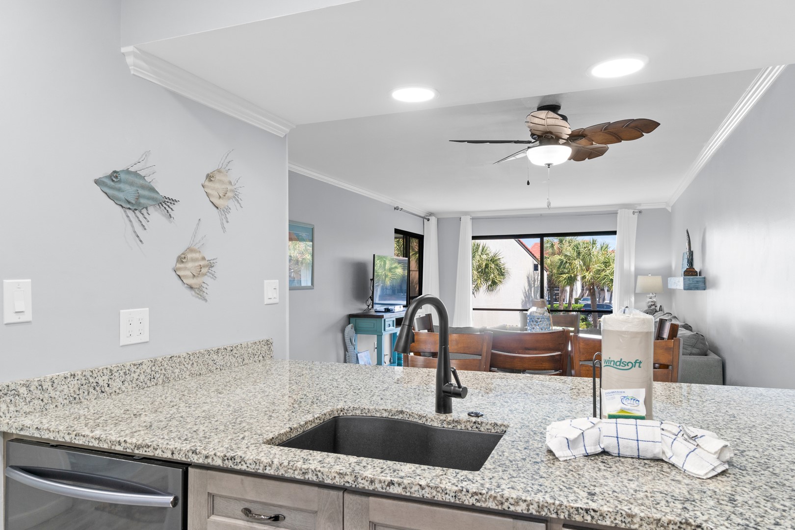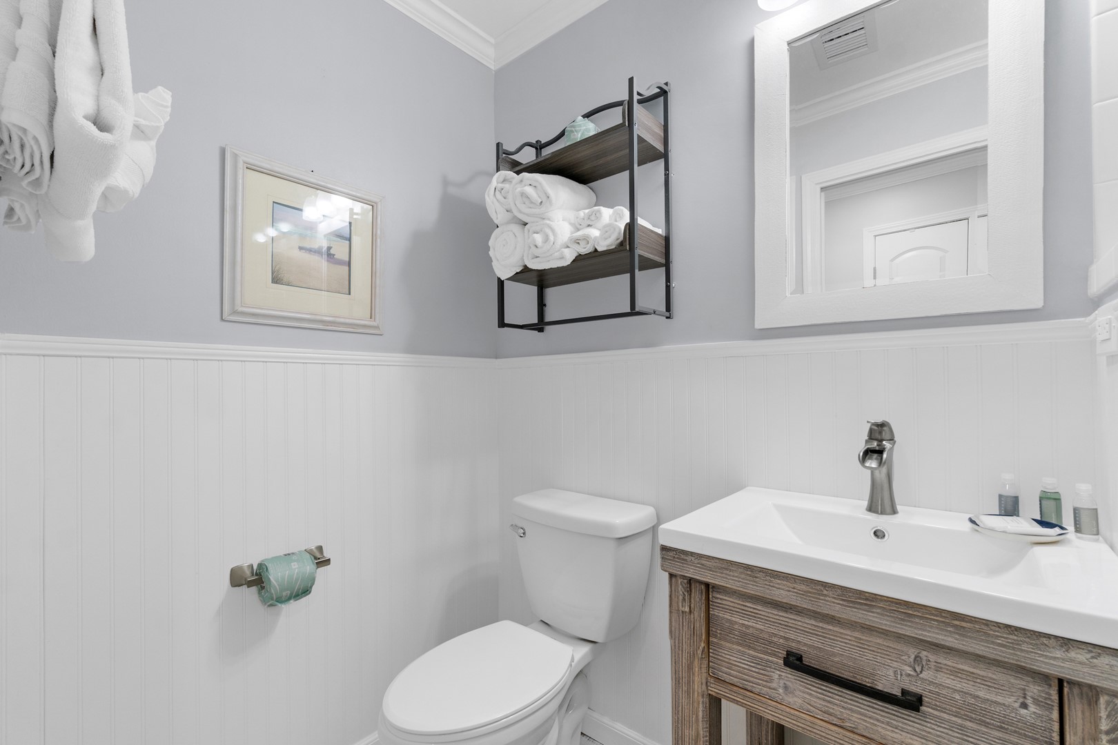 Panhandle Getaways furnishes a few essential items for guests to utilize until they can get to the grocery store. Initial Supplies include: Dishwasher soap, small washing machine powder, each bathroom has amenities (like hotel but NOT restocked) shampoo, conditioner, soap bar. One roll of toilet paper in each bathroom and one paper towel roll in the kitchen. All bed linens and towels are provided. We encourage guests to bring beach towels for use at the pool and beach.