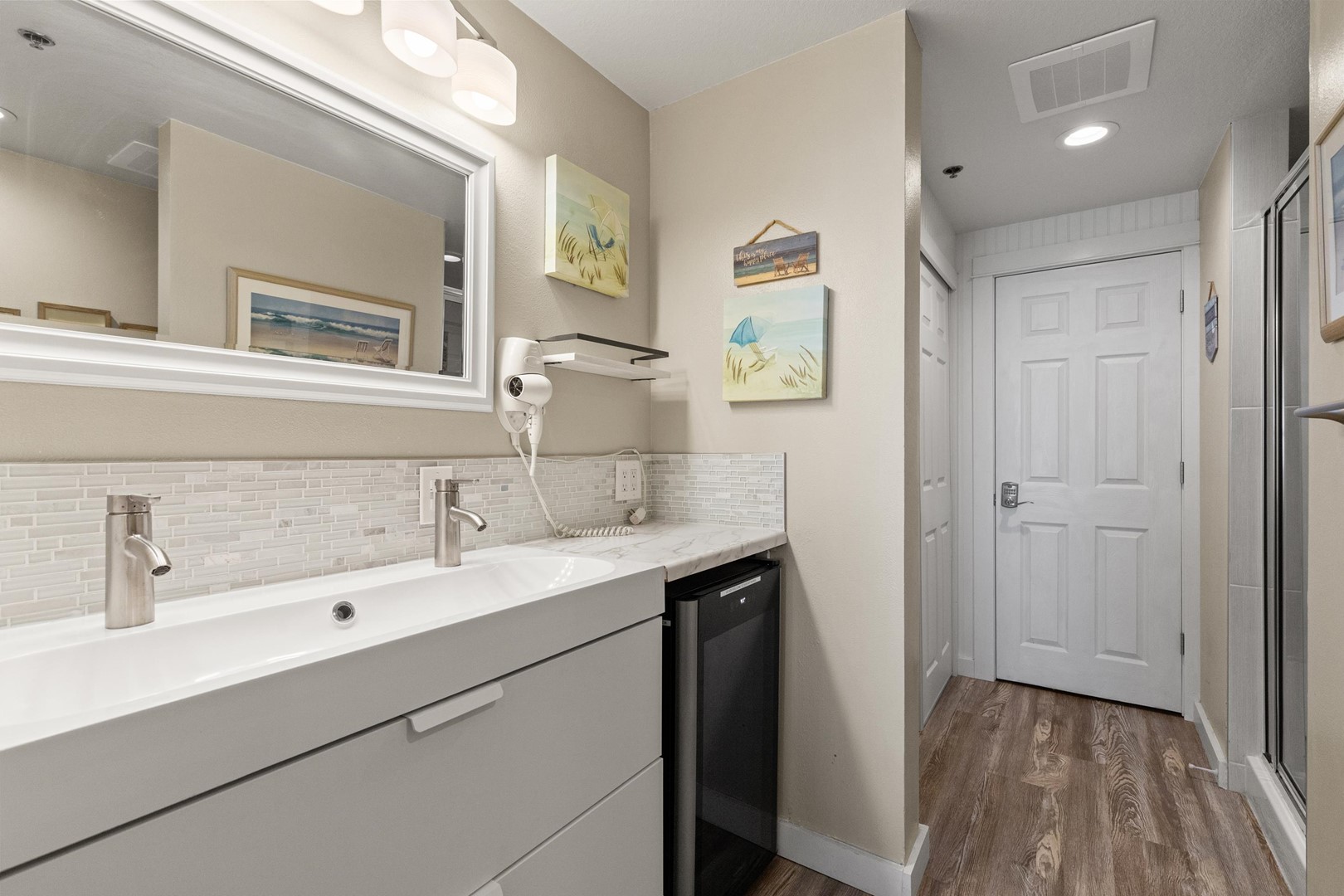 • Bedroom 1: King bed, balcony access, 55" Smart TV, en suite bathroom